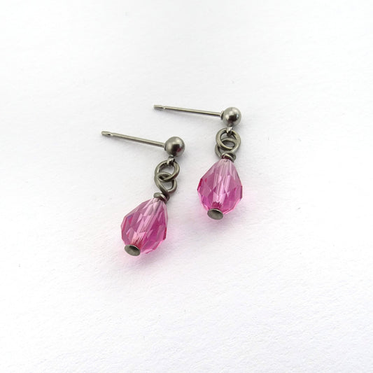Titanium Post Earrings with Rose Pink Drop Crystals