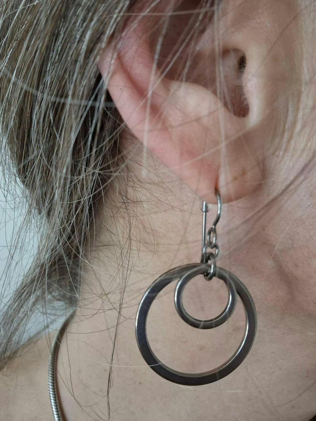 These double-hoop titanium earrings are made out of two titanium circles. They dangle from your choice of niobium or titanium ear wires. These earrings are made entirely out of hypoallergenic nickel-free titanium and niobium. They are great for every day. Simple and modern and go with everything.