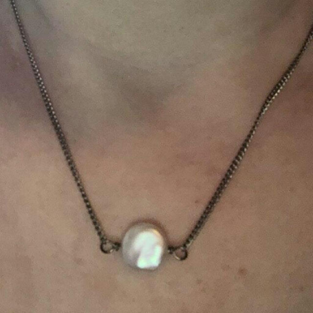 One beautiful ivory round coin-shaped pearl is wire-wrapped with hypoallergenic niobium wire on a titanium curb chain. The titanium curbed chain has a width of 1.8 mm and closes with a titanium lobster clasp. This necklace is completely made from Niobium and Titanium, which are both nickel-free and specially designed for super-sensitive skin.