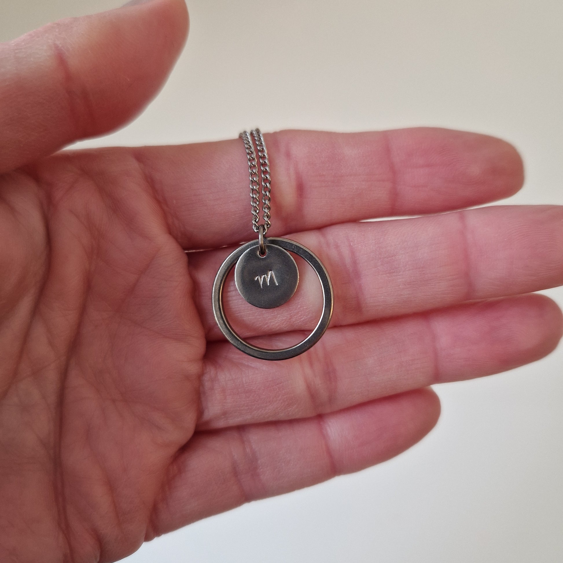 18" Small Curb Necklace with Letter m Stamped 11mm Disc and a 17mm x 21mm Titanium Circle Pendant