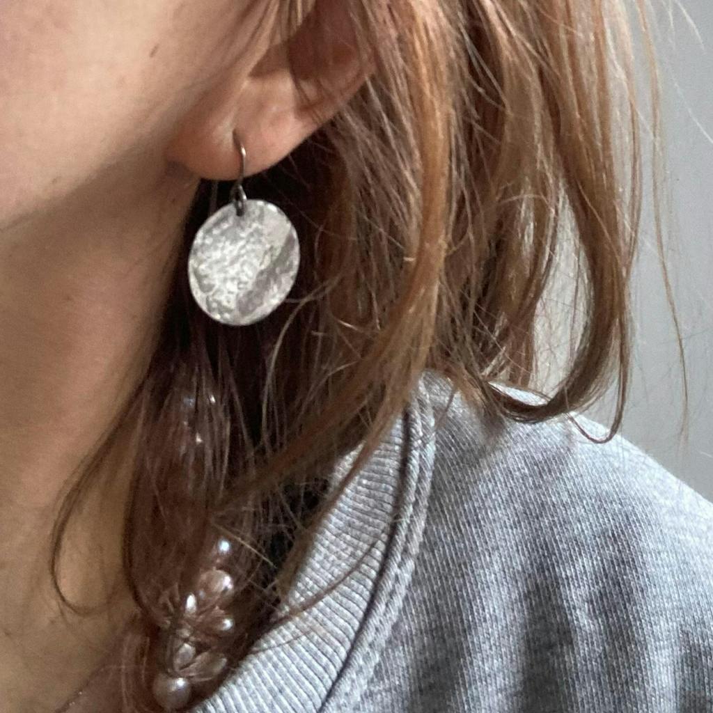 These modern hammered medium Niobium disc earrings are simple, but elegant everyday earrings. They are made from nickel free hypoallergenic Niobium in its natural silver grey color. The circles are hammered to give them a beautiful texture. They dangle from Titanium earwires in a french hook shape.