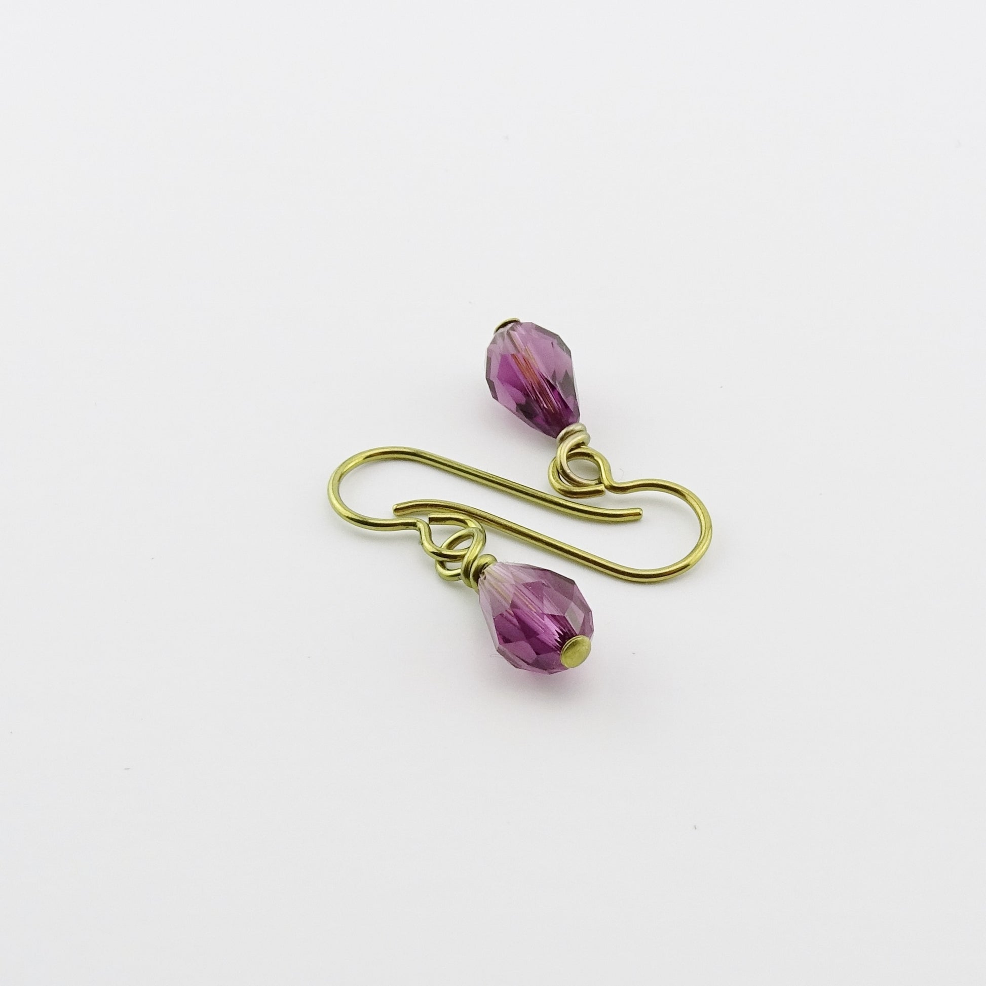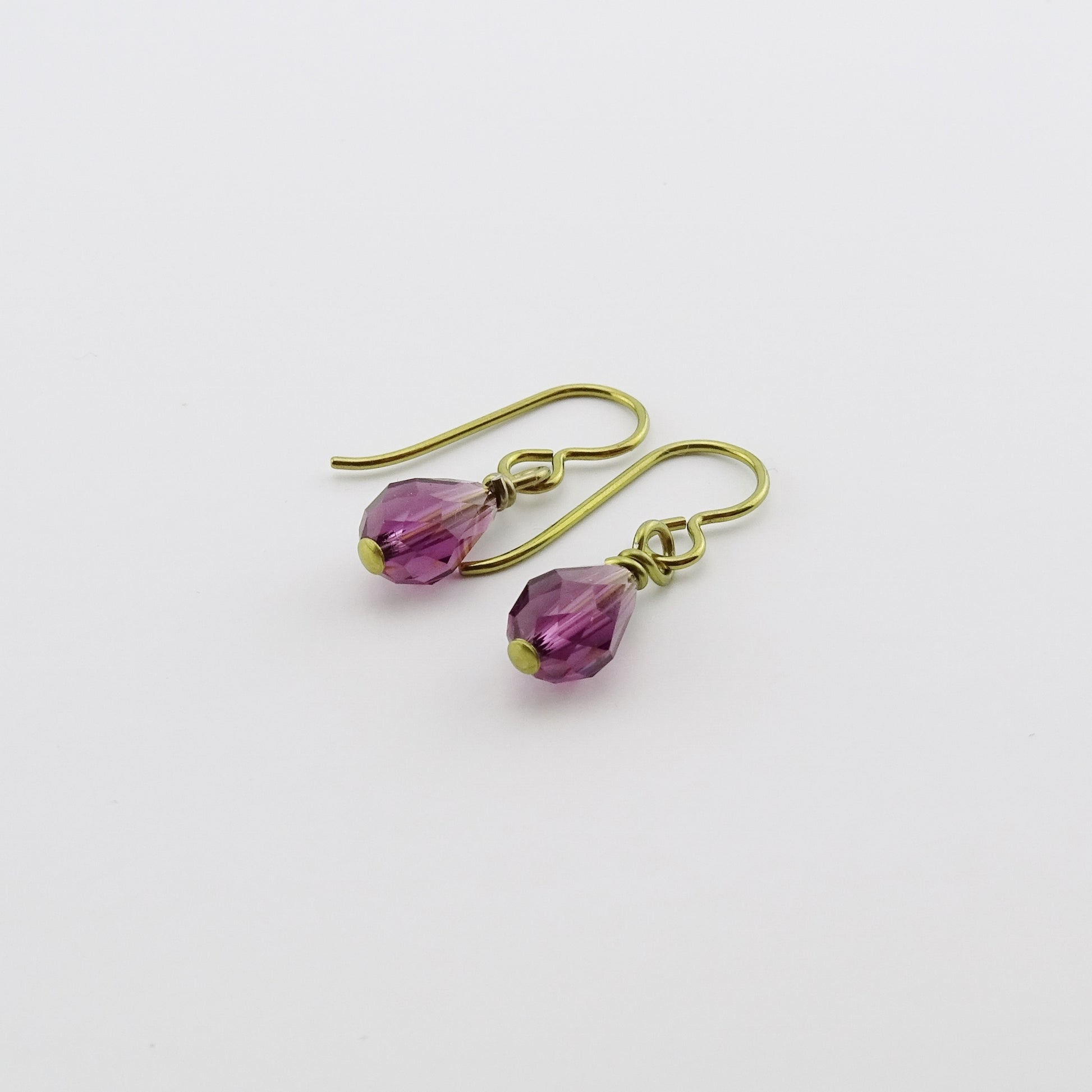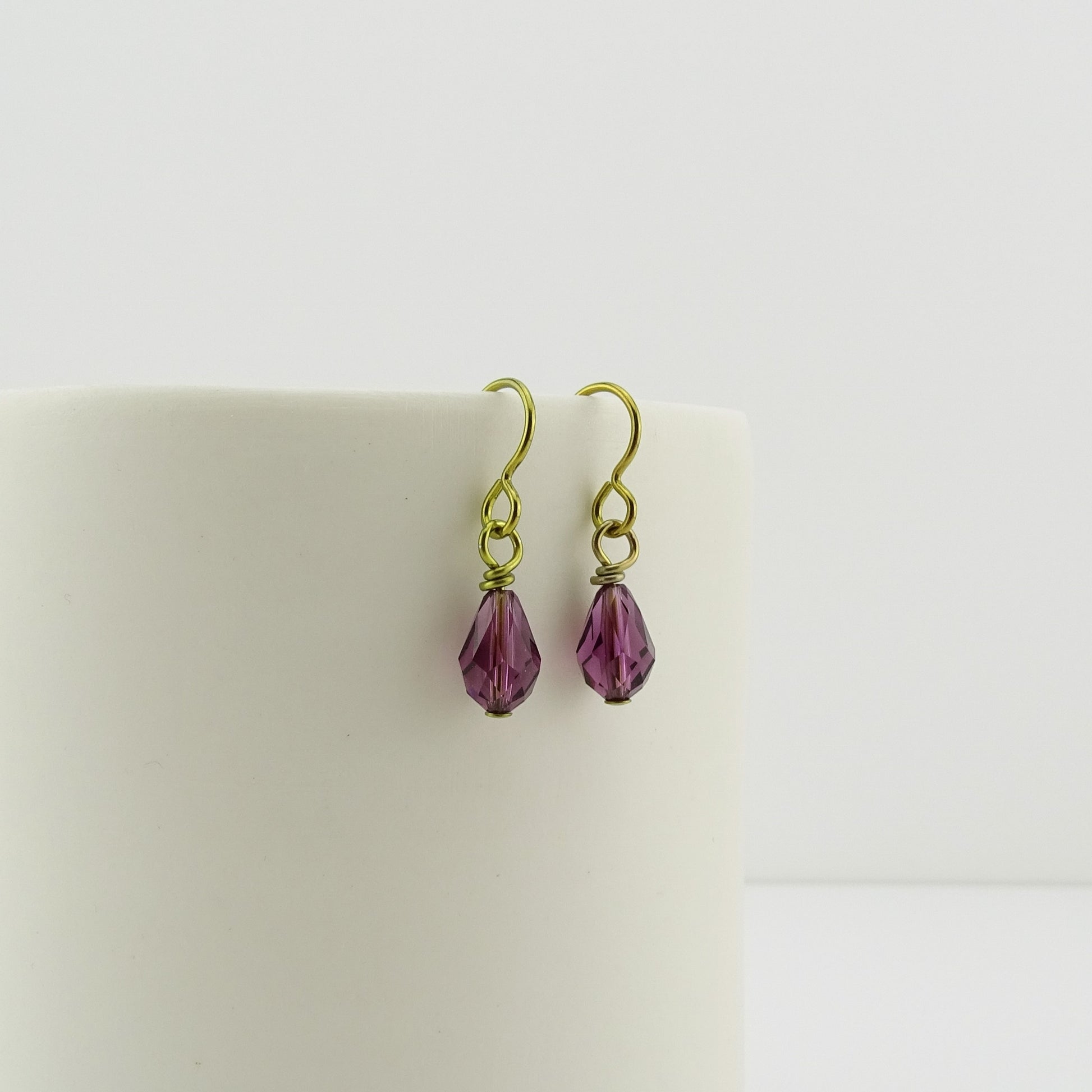 Nickel-free earrings with pretty purple amethyst-colored faceted crystal teardrops. They dangle from gold-colored pure hypo-allergenic niobium ear wires. Simply the perfect color add-on for any day.