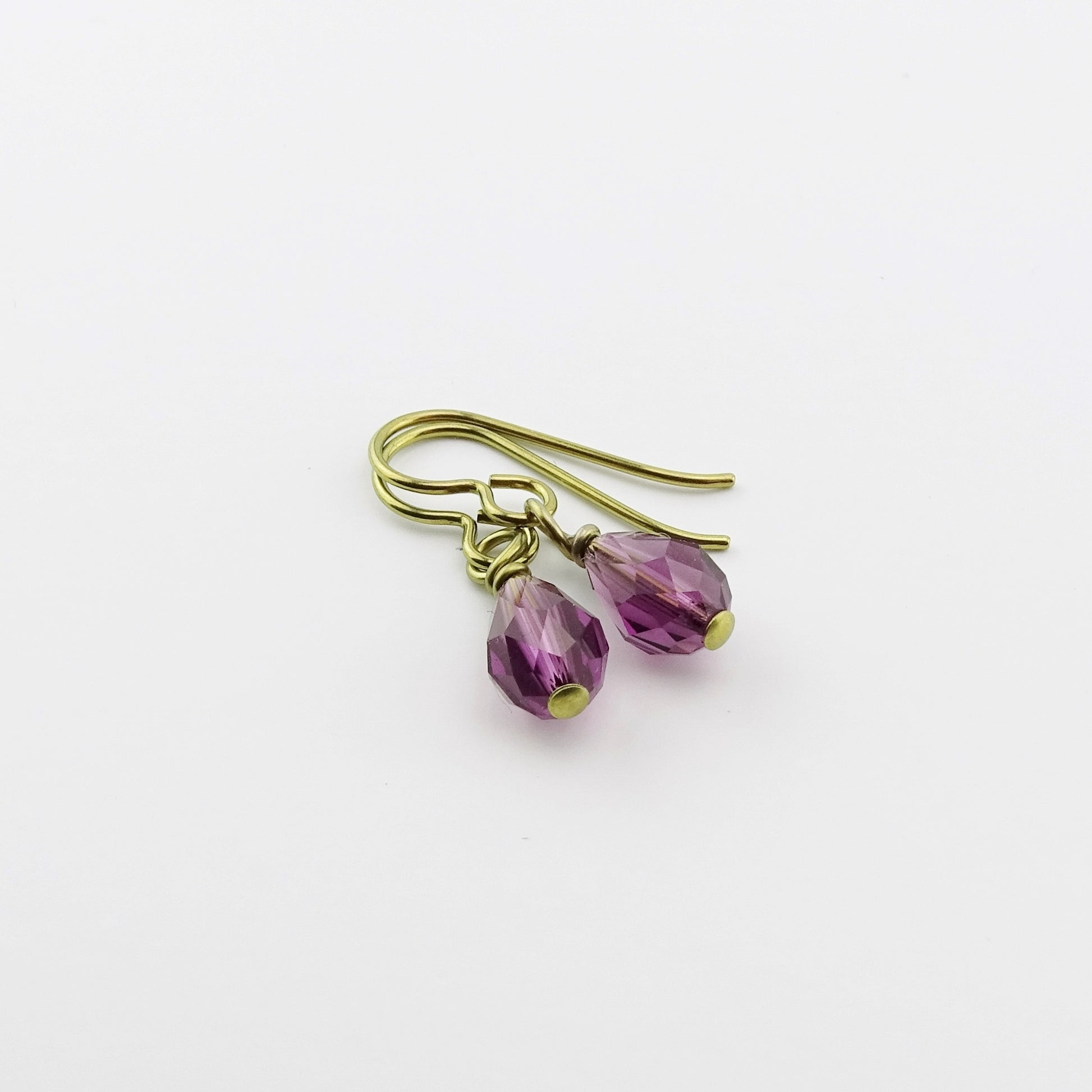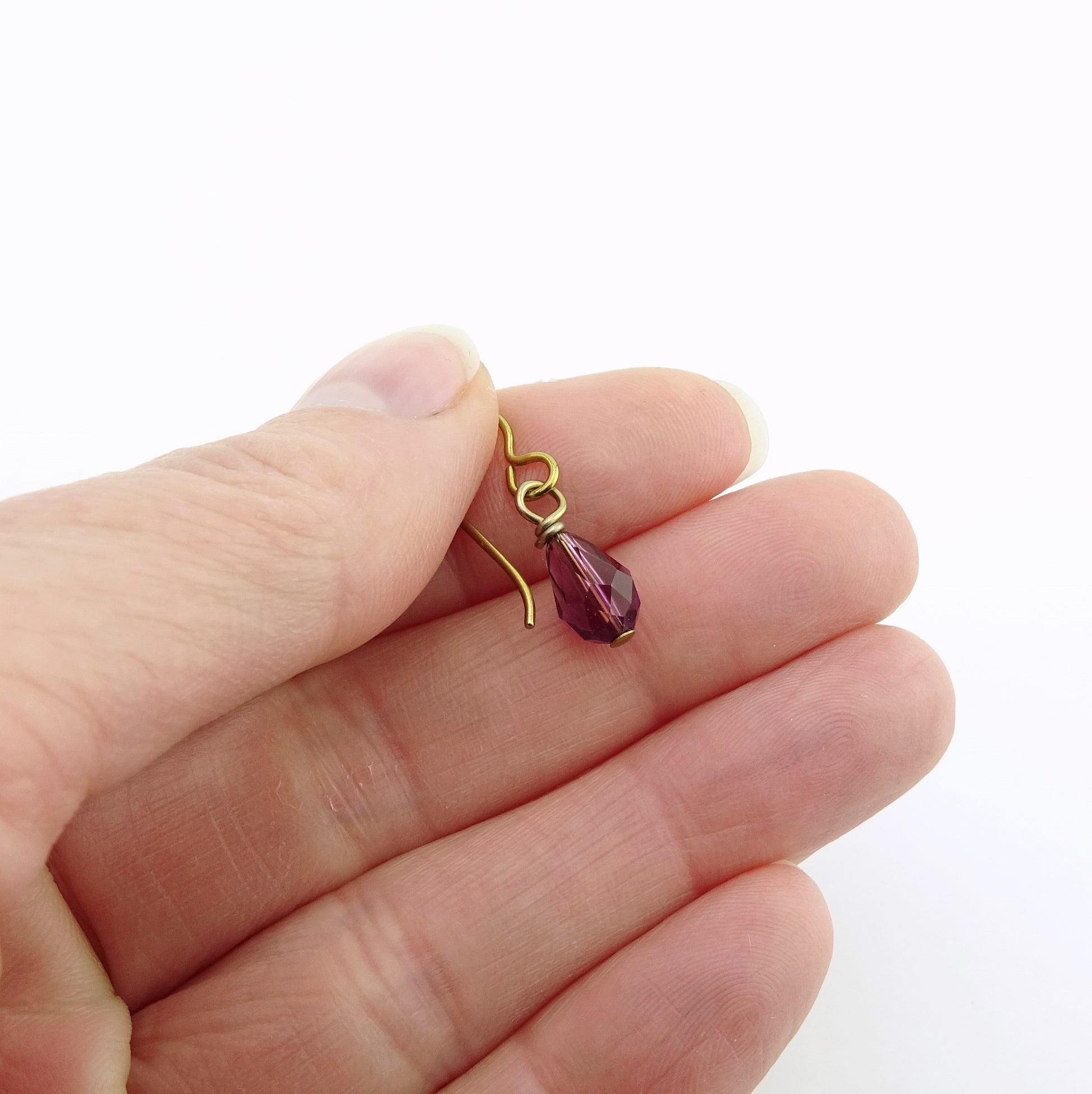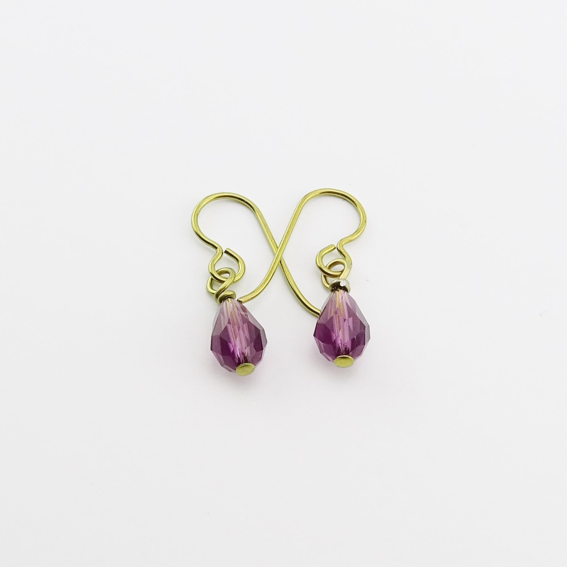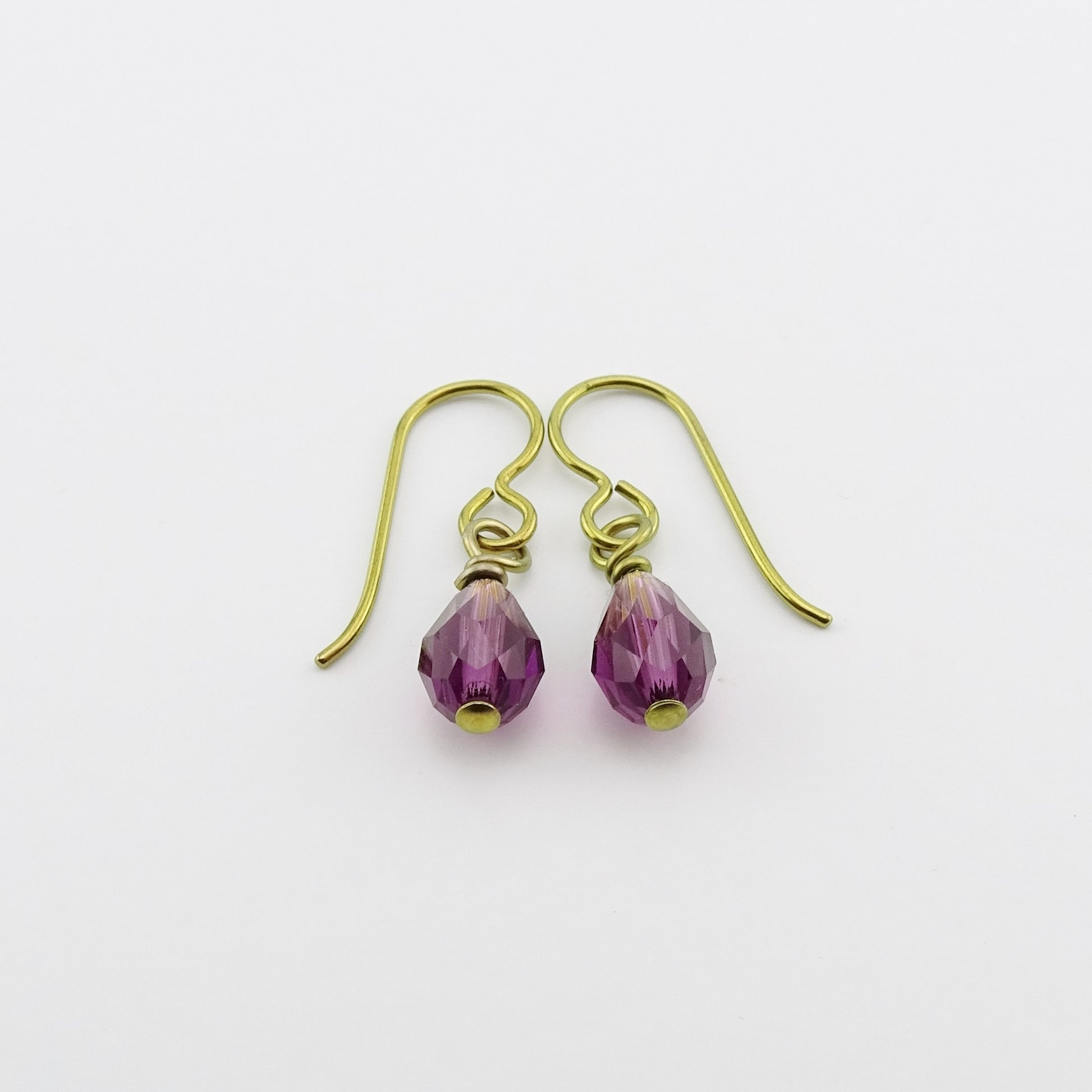 Nickel-free earrings with pretty purple amethyst-colored faceted crystal teardrops. They dangle from gold-colored pure hypo-allergenic niobium ear wires. Simply the perfect color add-on for any day.