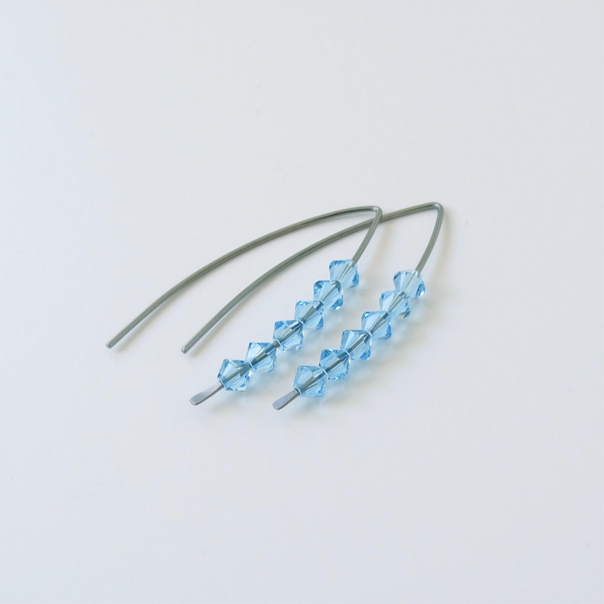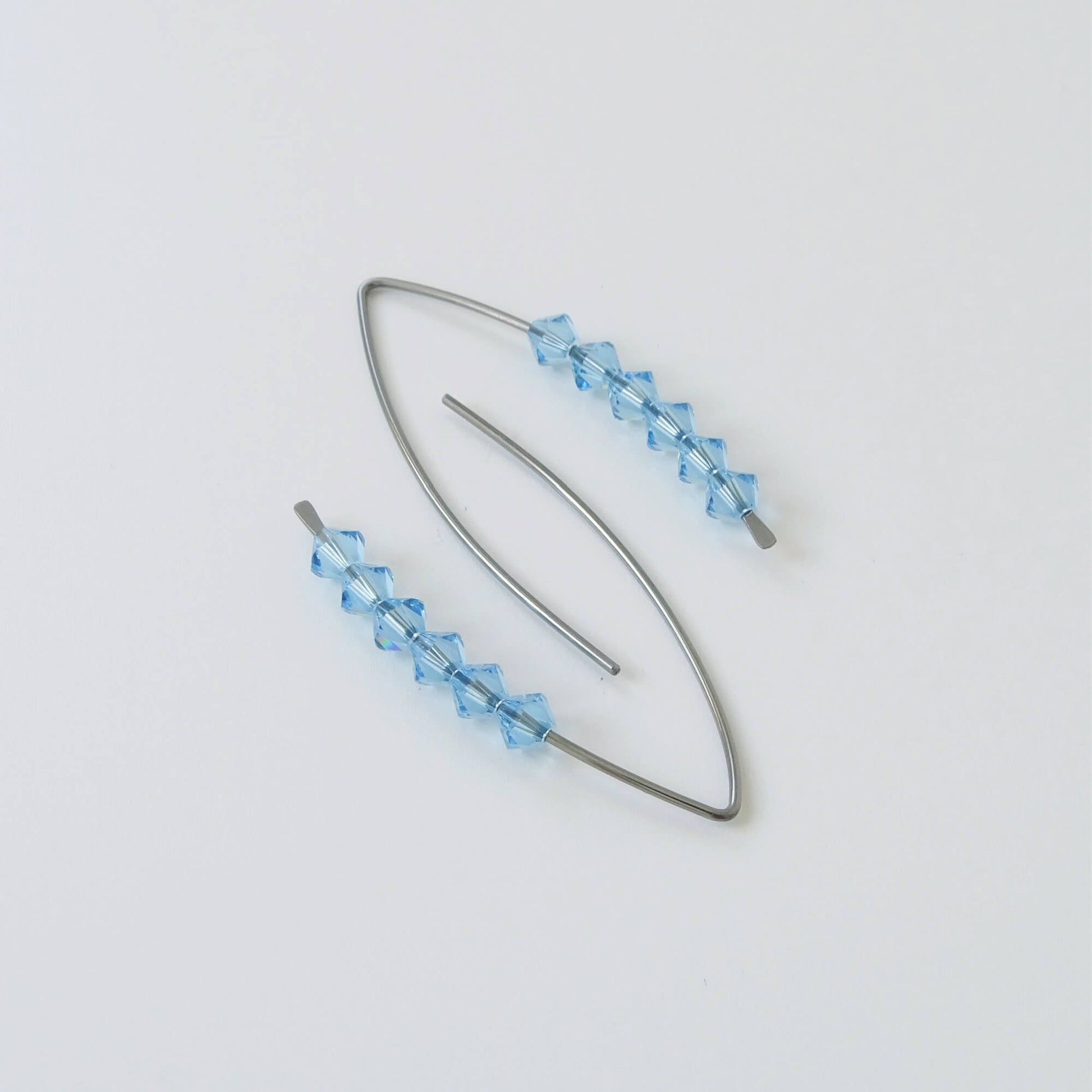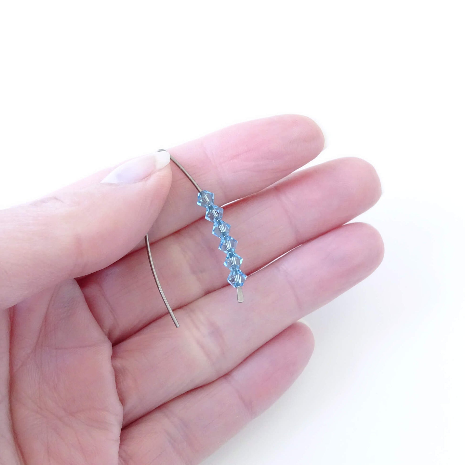 Eye-catching aquamarine blue crystals on Niobium threader earrings. The Niobium wire is hammered and hand-formed into this elegant wishbone shape. The use of Niobium makes them perfect for when you have sensitive earlobes. These earrings can be matched with a pair of jeans or sparkle with a cocktail dress and will be worn comfortably all day long.