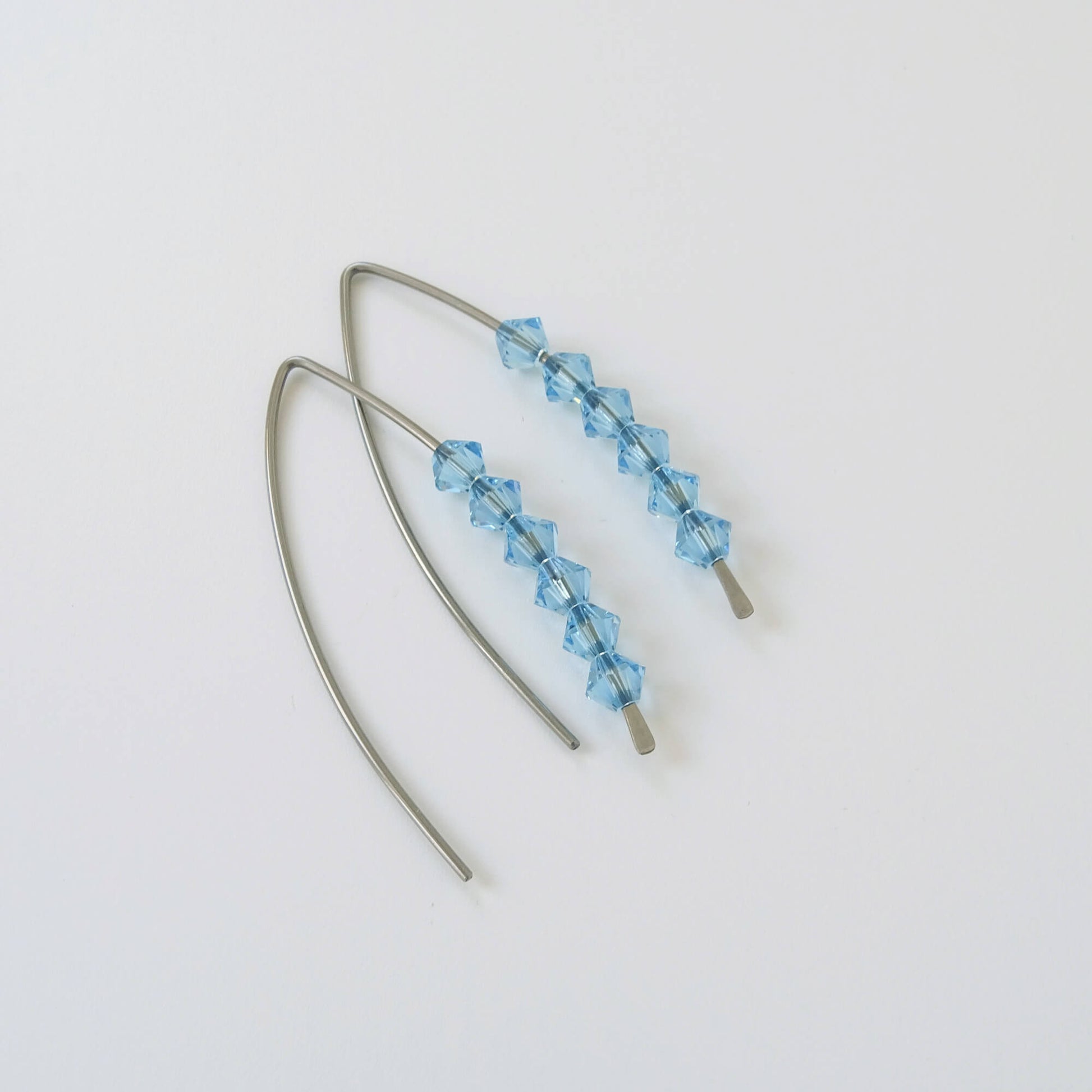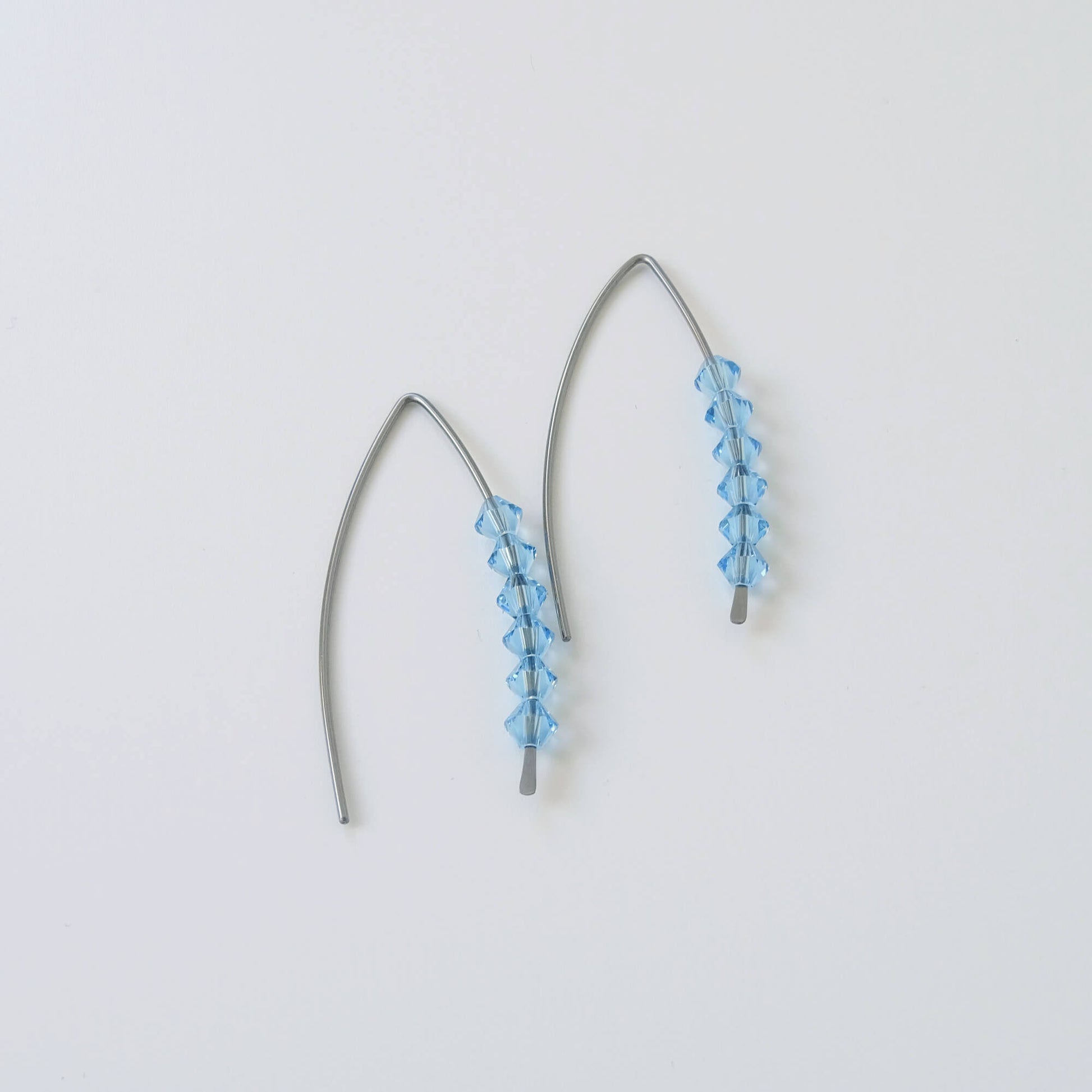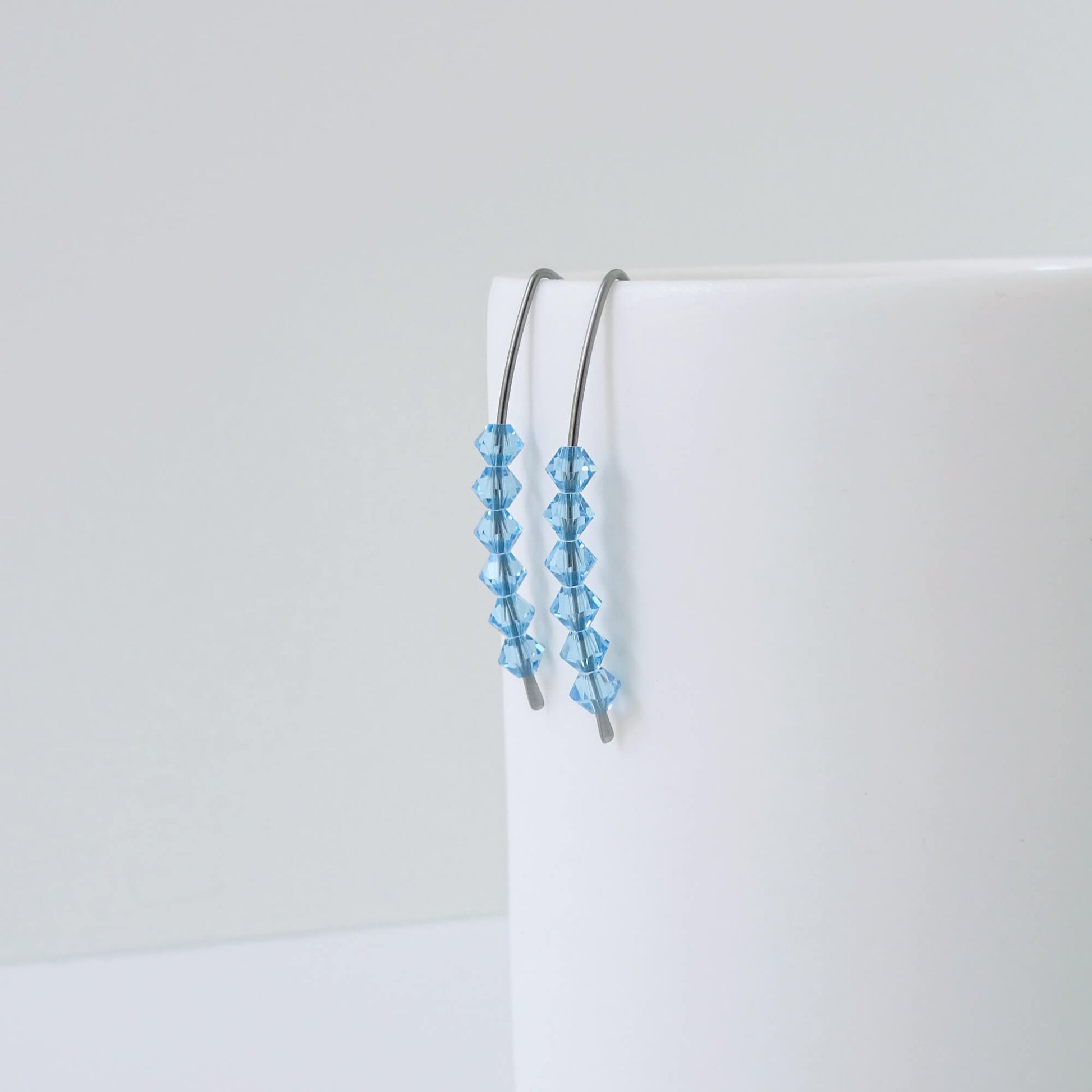 Eye-catching aquamarine blue crystals on Niobium threader earrings. The Niobium wire is hammered and hand-formed into this elegant wishbone shape. The use of Niobium makes them perfect for when you have sensitive earlobes. These earrings can be matched with a pair of jeans or sparkle with a cocktail dress and will be worn comfortably all day long.