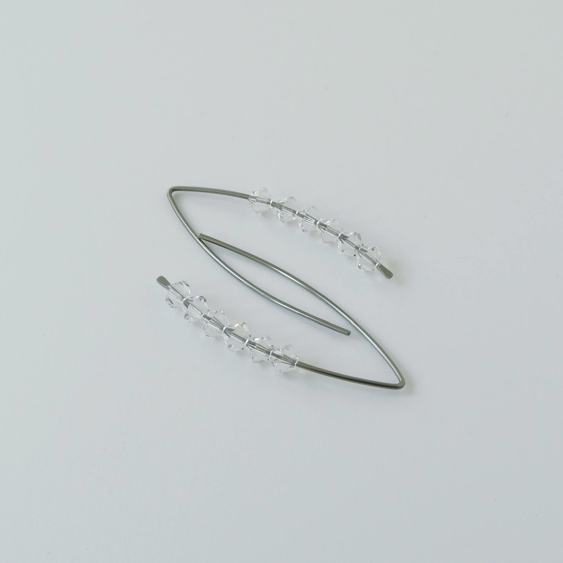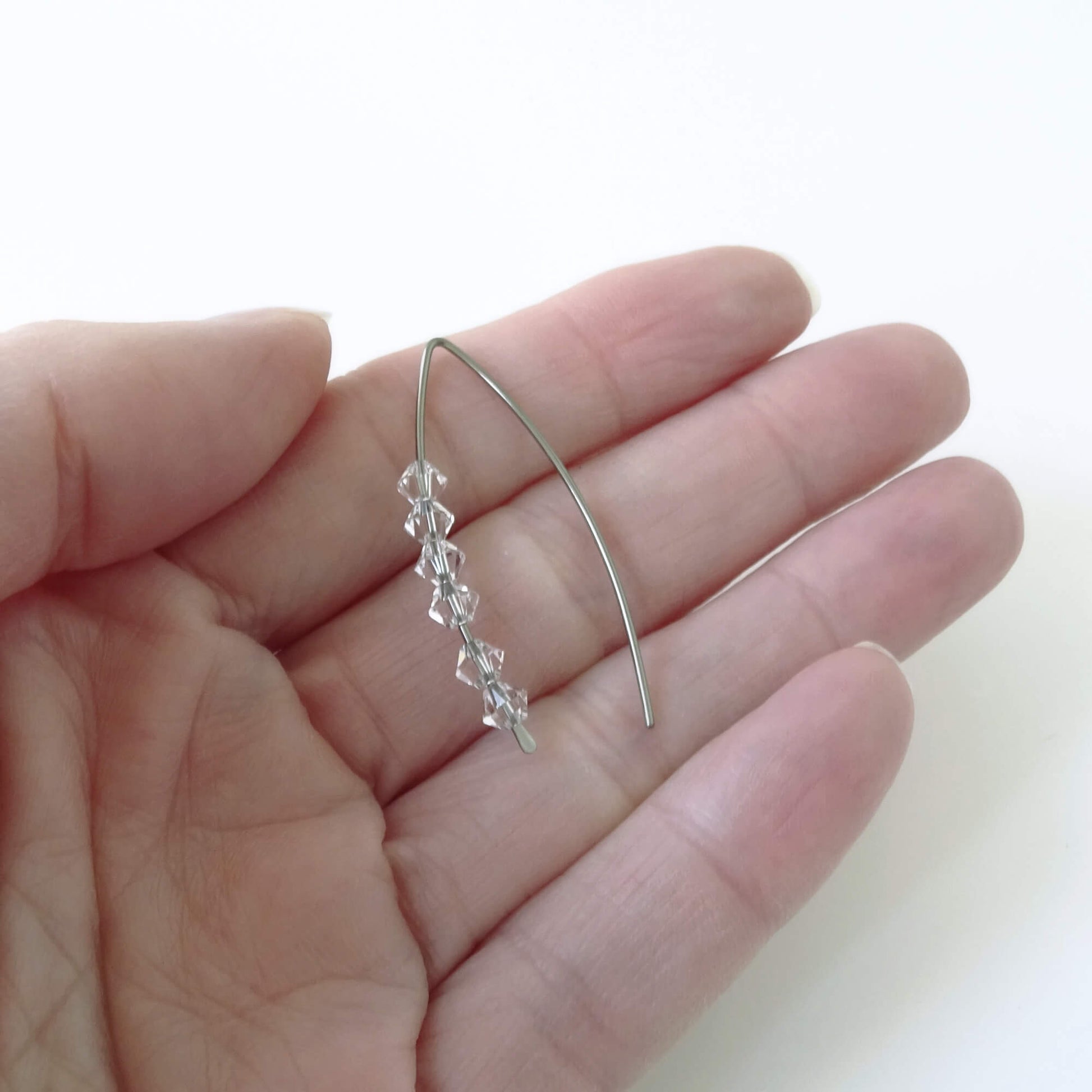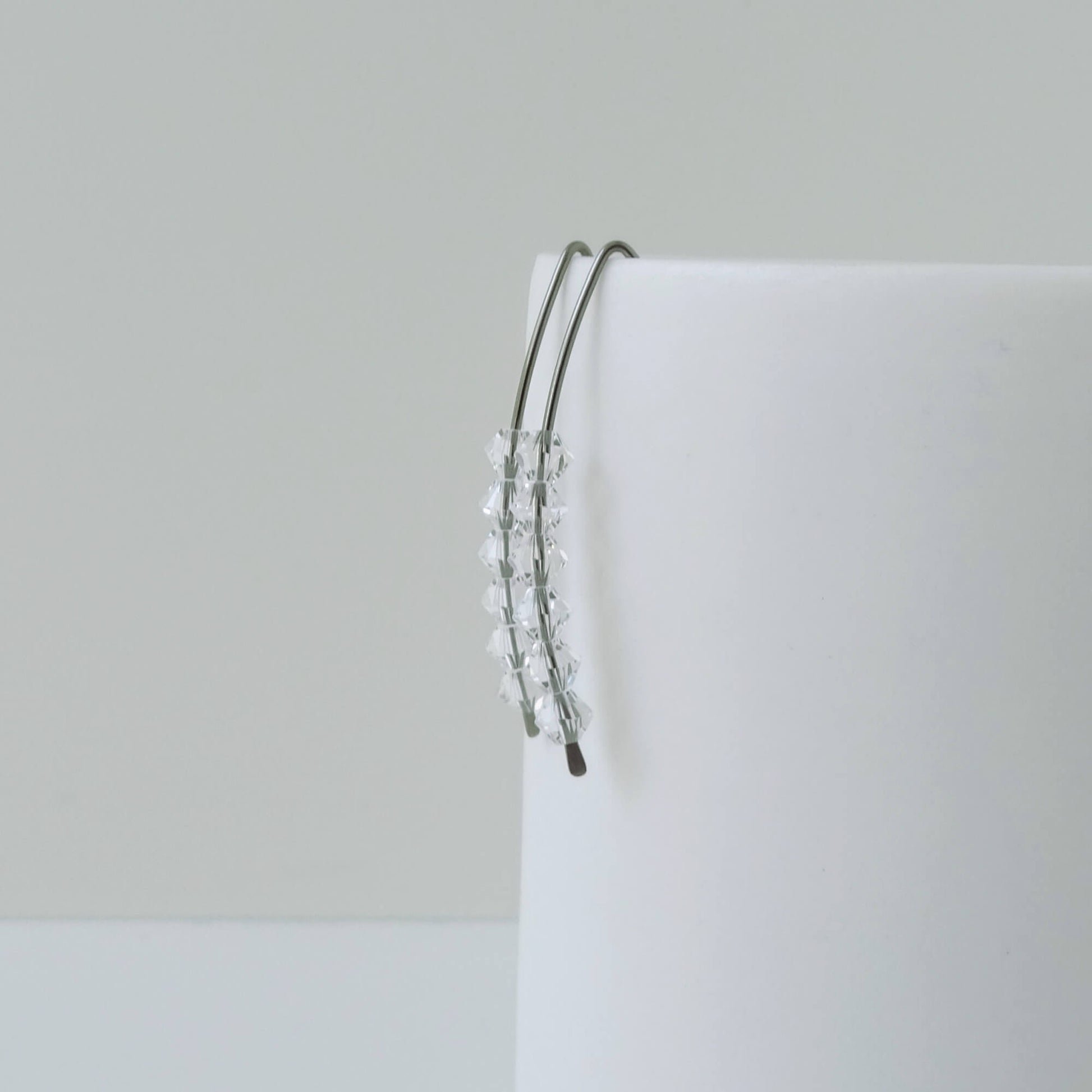 Eye-catching Clear European crystals on Niobium threader earrings. The Niobium wire is hammered and hand-formed into this elegant wishbone shape. The use of Niobium makes them perfect for when you have sensitive earlobes. These earrings can be matched with a pair of jeans or sparkle with a cocktail dress and will be worn comfortably all day long.
