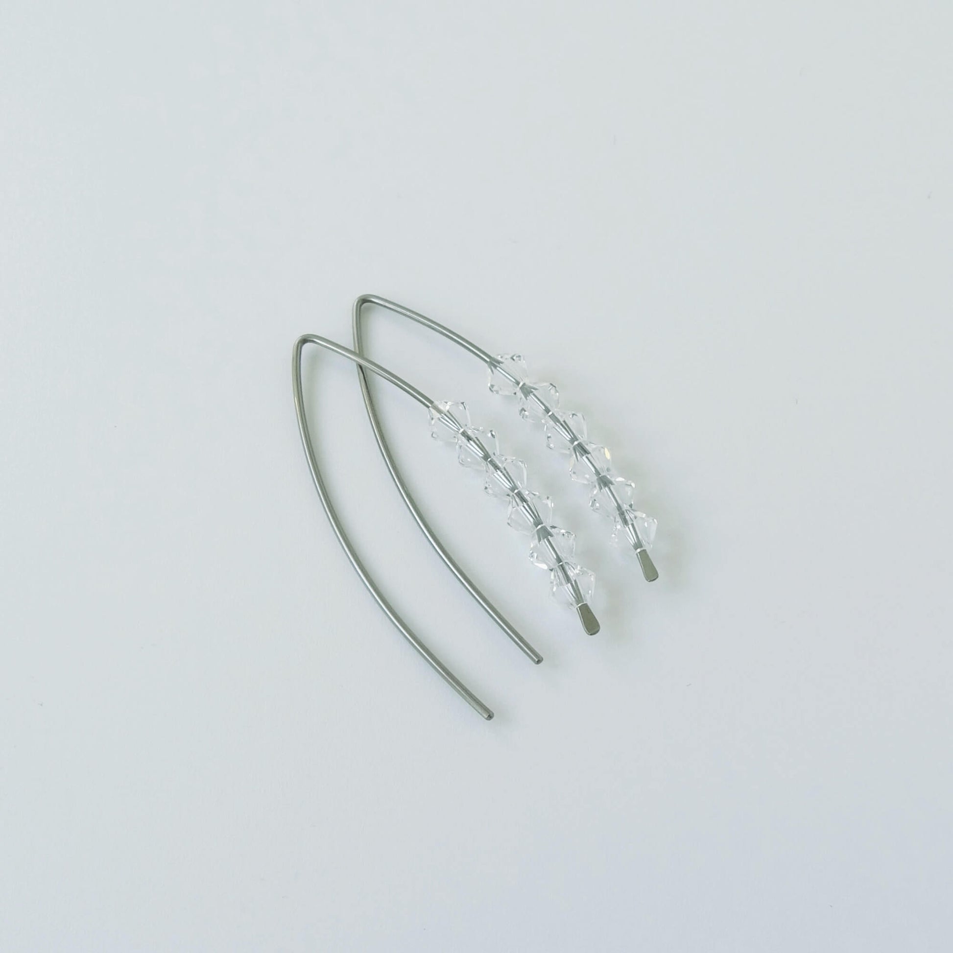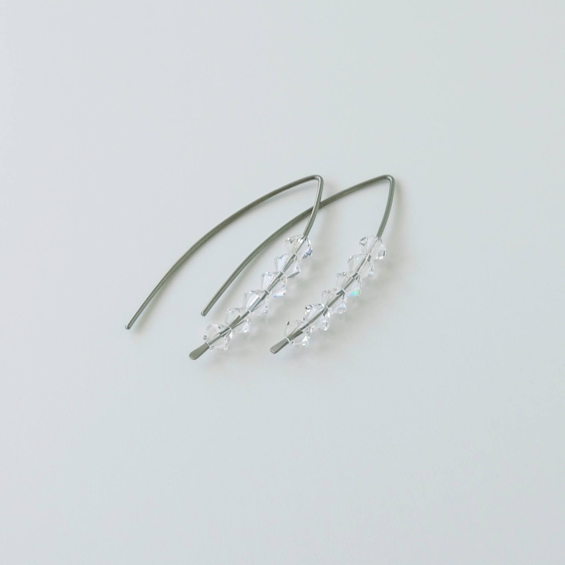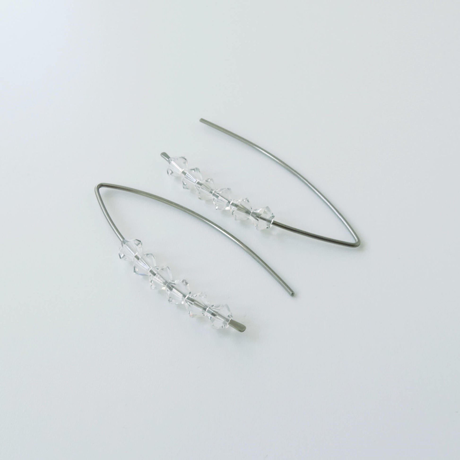 Eye-catching Clear European crystals on Niobium threader earrings. The Niobium wire is hammered and hand-formed into this elegant wishbone shape. The use of Niobium makes them perfect for when you have sensitive earlobes. These earrings can be matched with a pair of jeans or sparkle with a cocktail dress and will be worn comfortably all day long.