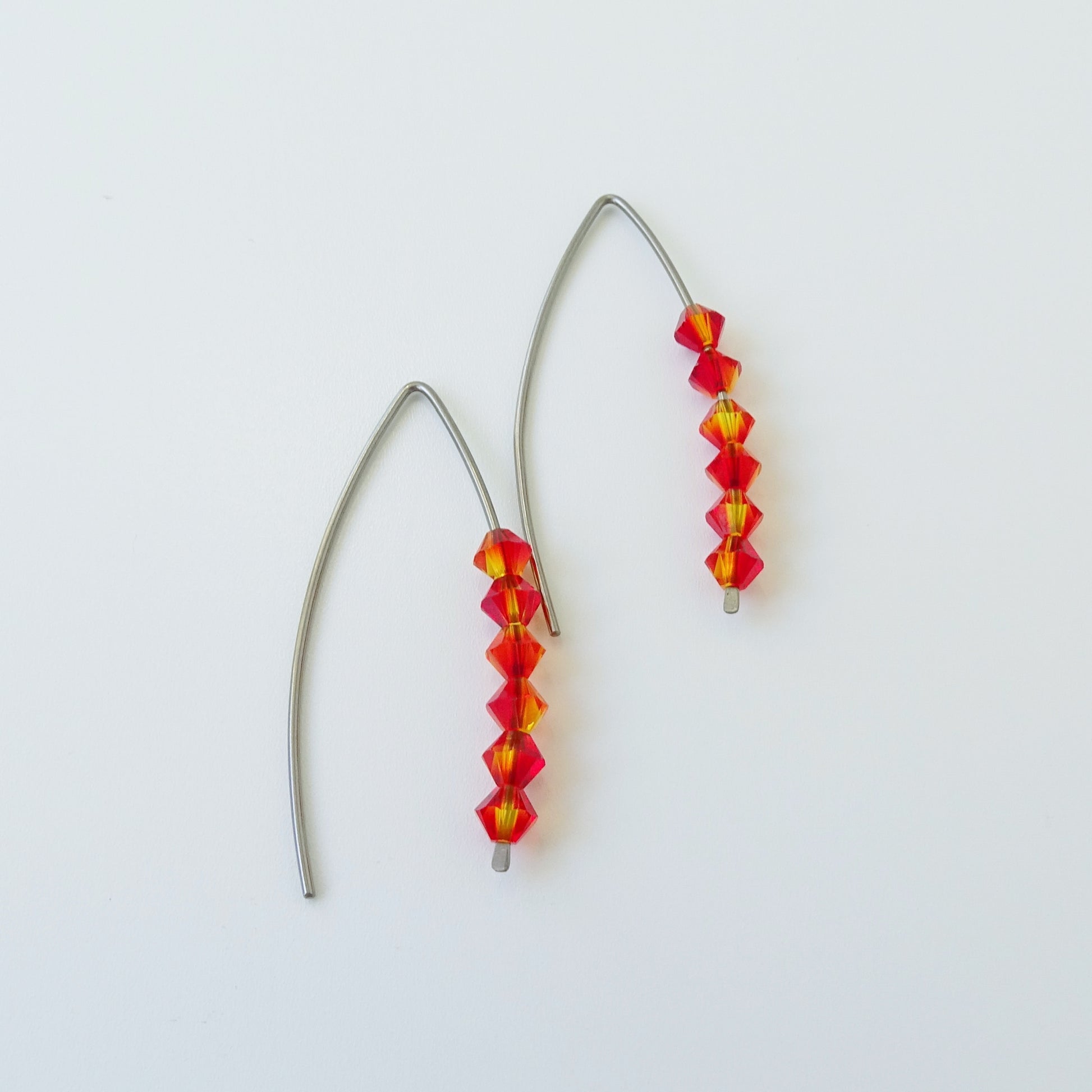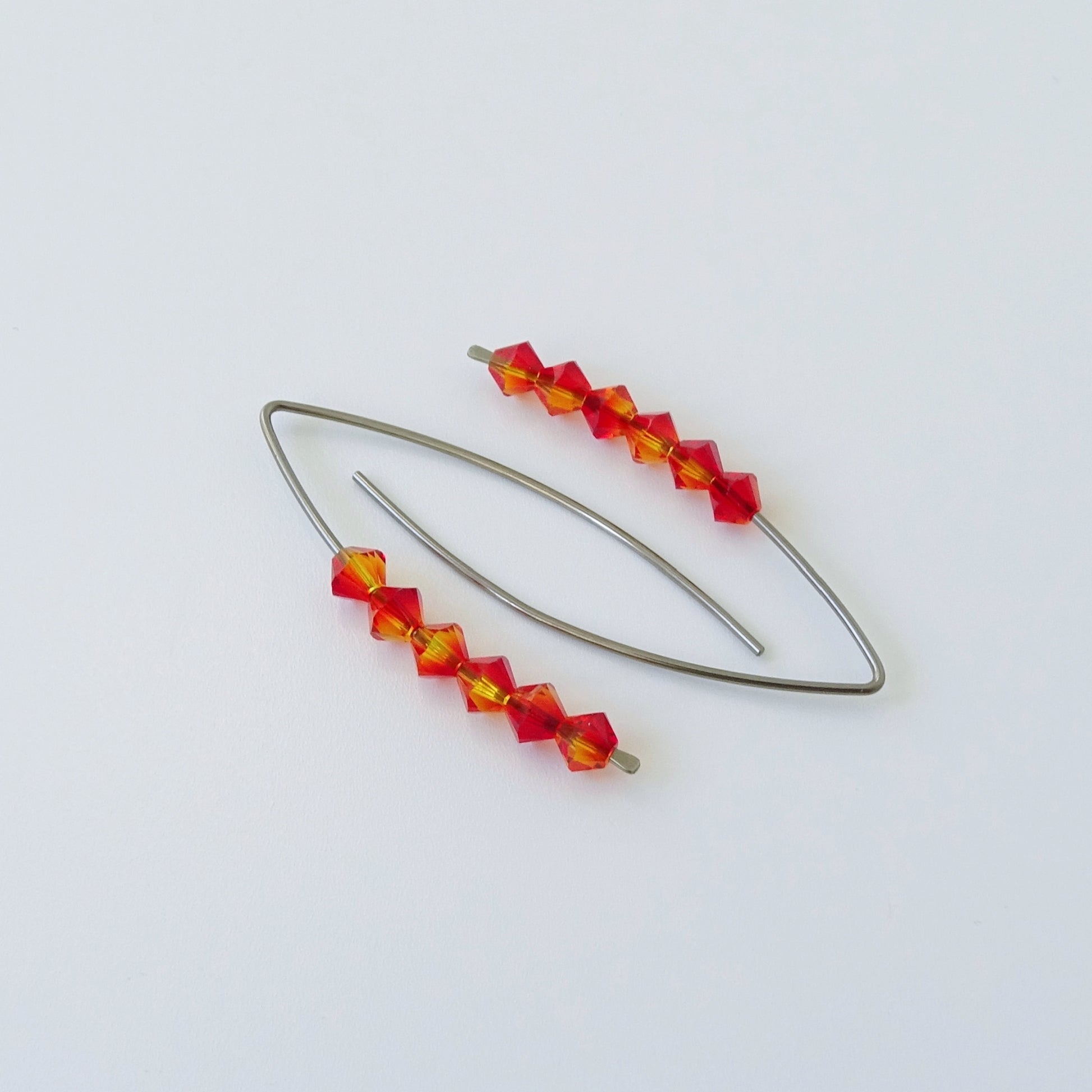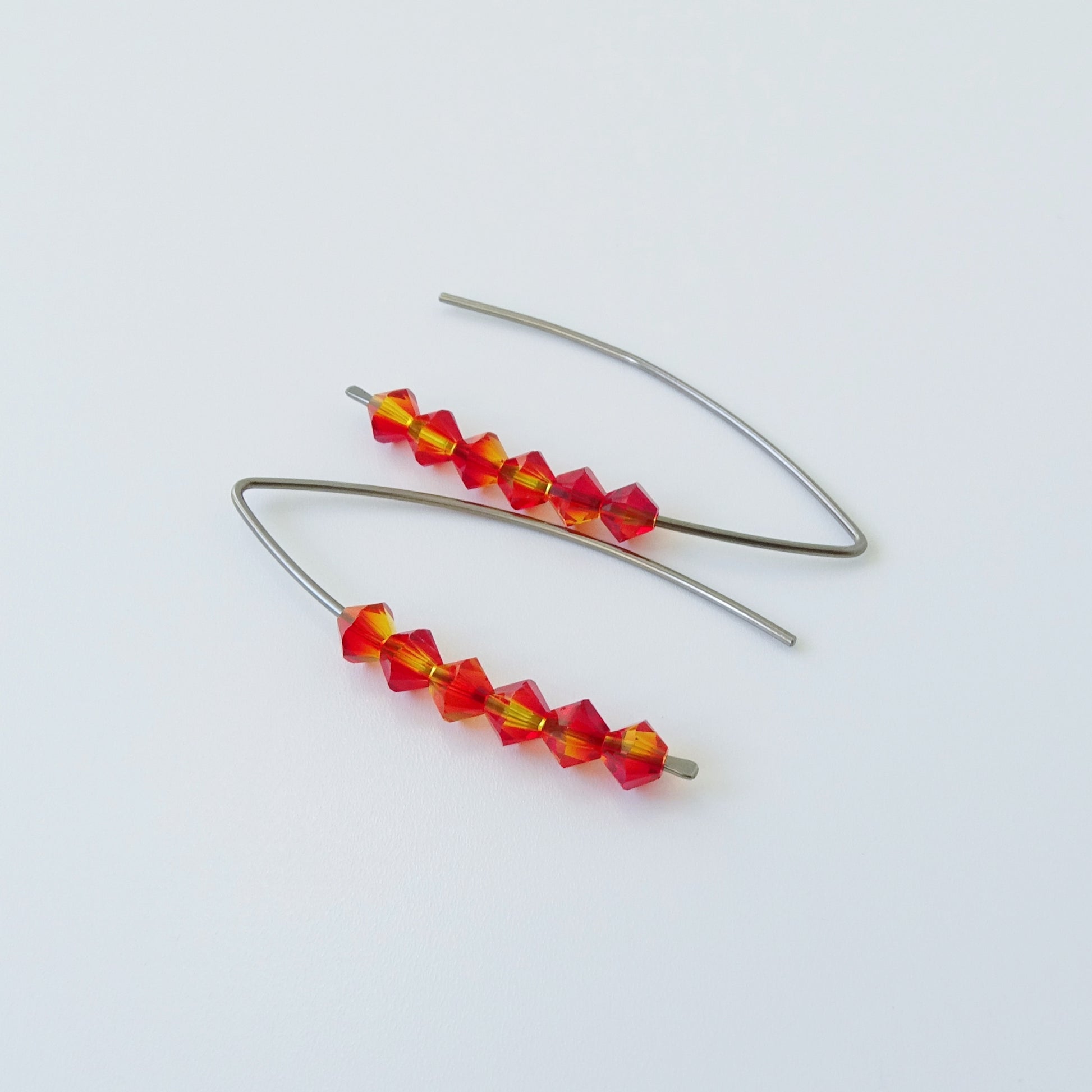 Eye-catching orange fire opal European crystals on Niobium threader earrings. The Niobium wire is hammered and hand-formed into this elegant wishbone shape. The use of Niobium makes them perfect for when you have sensitive earlobes. These earrings can be matched with a pair of jeans or sparkle with a cocktail dress and will be worn comfortably all day long.