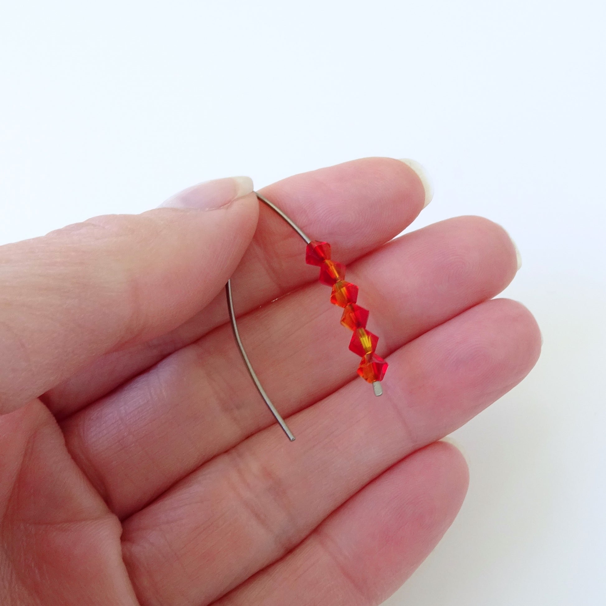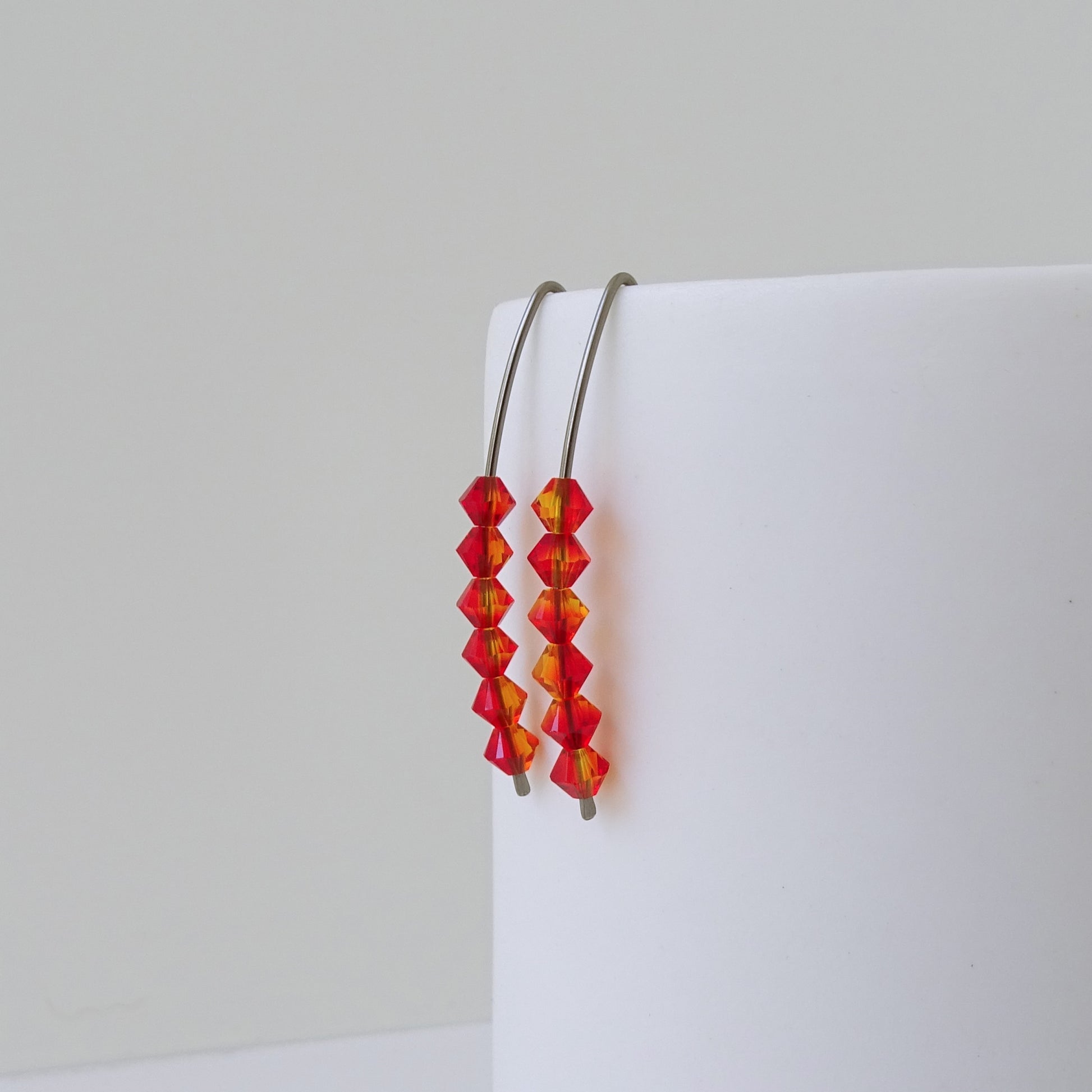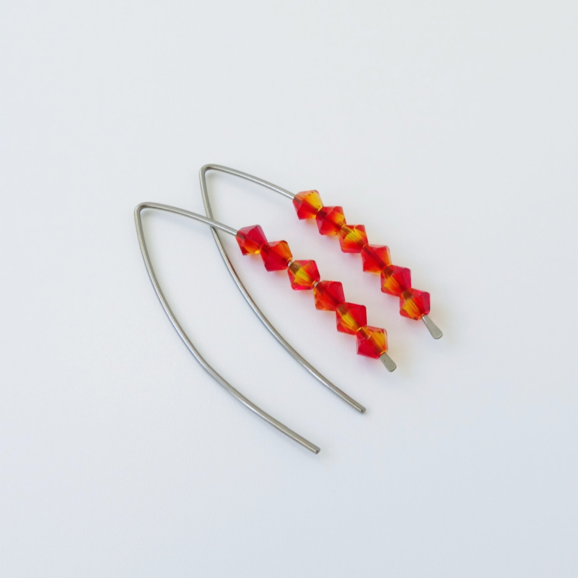 Eye-catching orange fire opal European crystals on Niobium threader earrings. The Niobium wire is hammered and hand-formed into this elegant wishbone shape. The use of Niobium makes them perfect for when you have sensitive earlobes. These earrings can be matched with a pair of jeans or sparkle with a cocktail dress and will be worn comfortably all day long.
