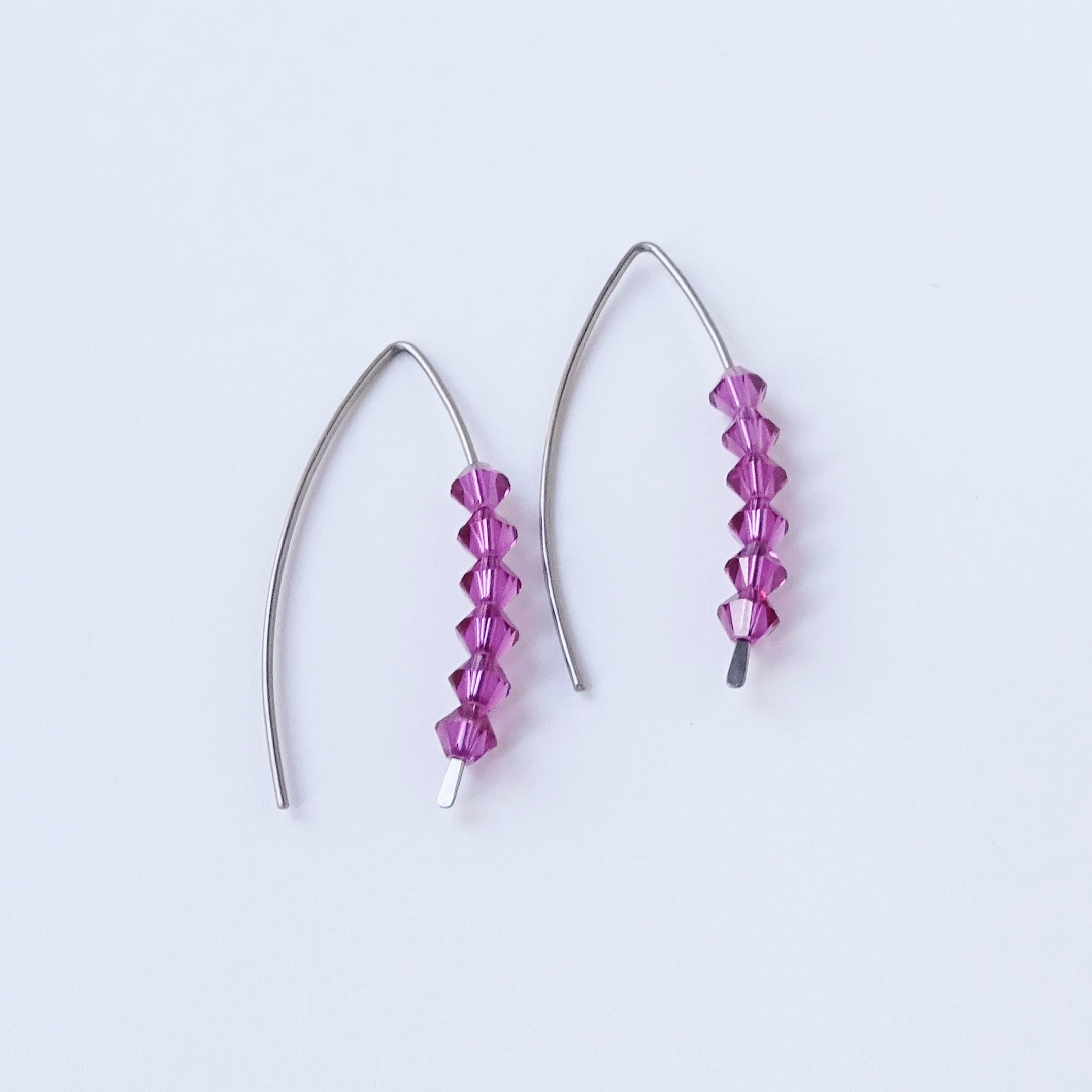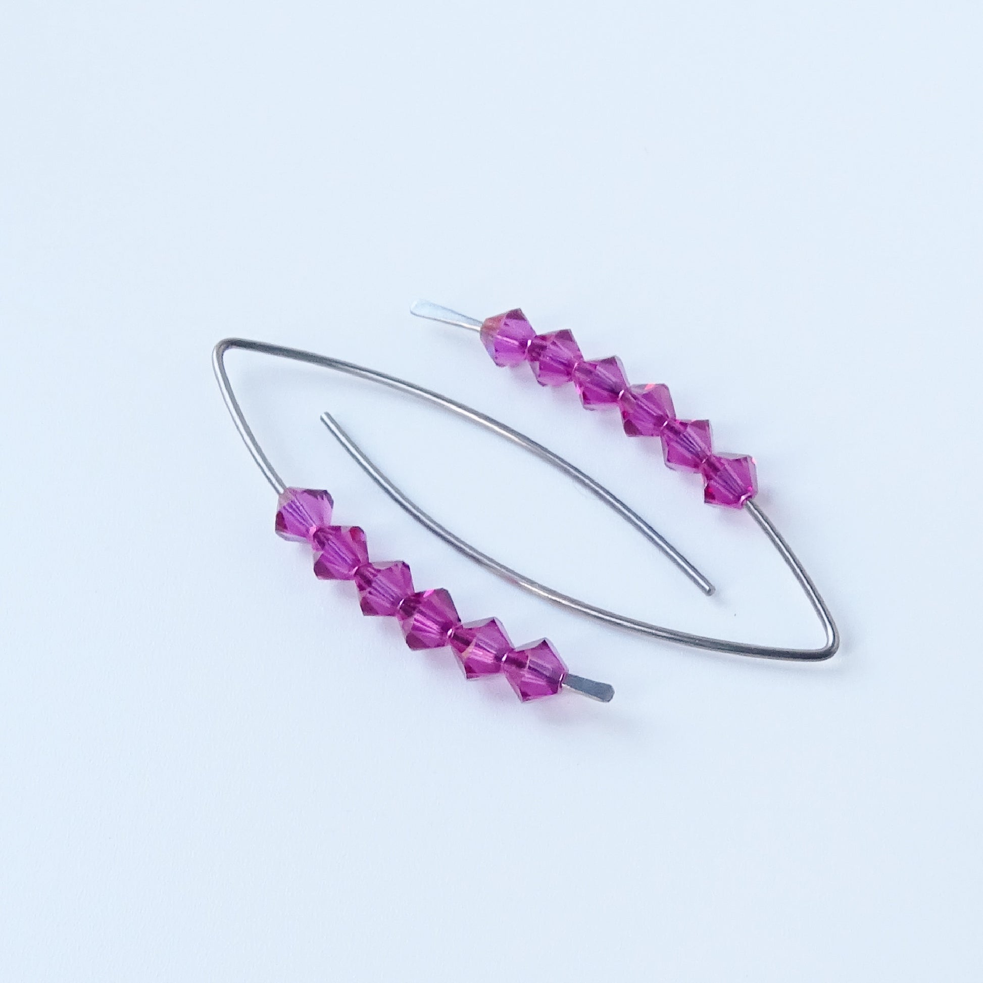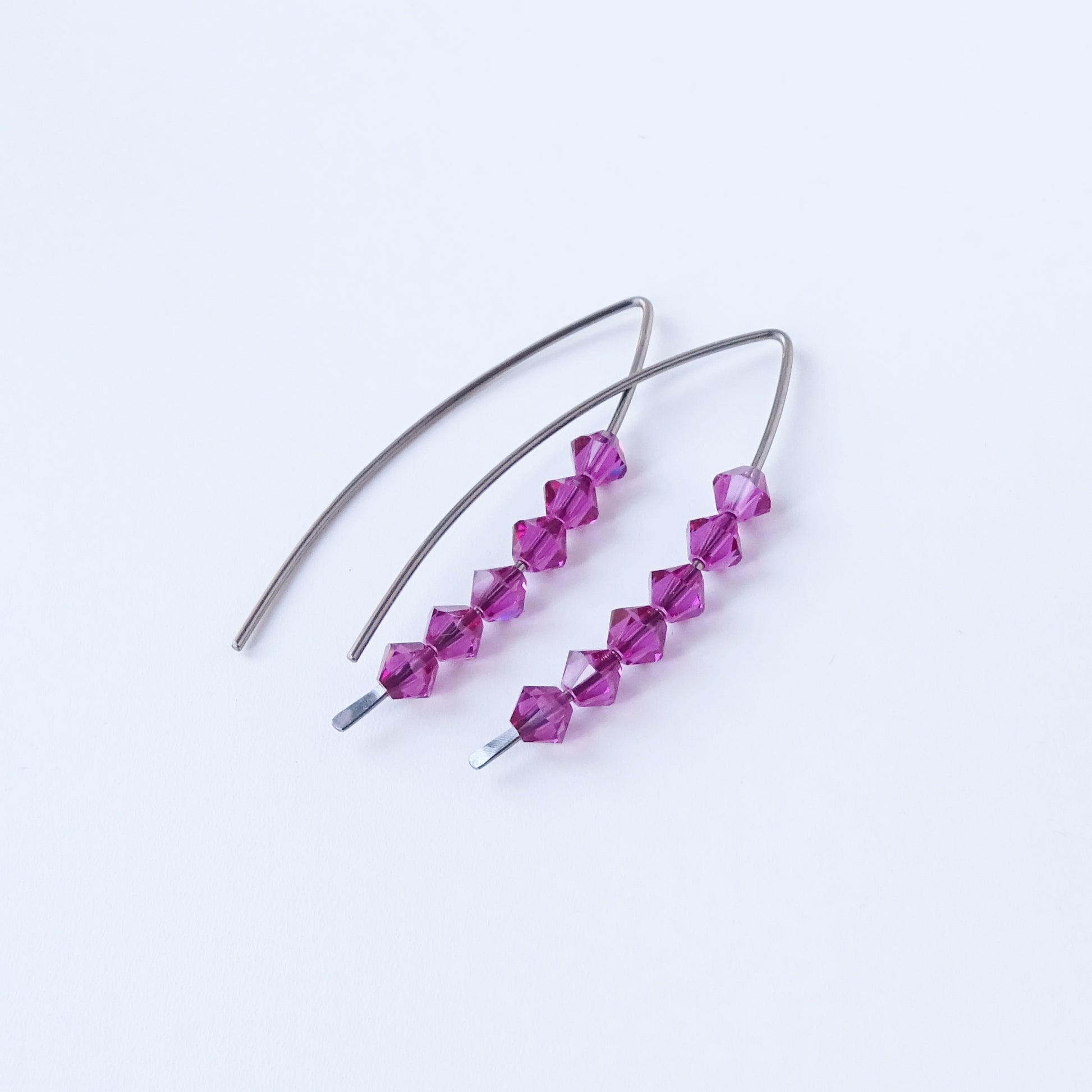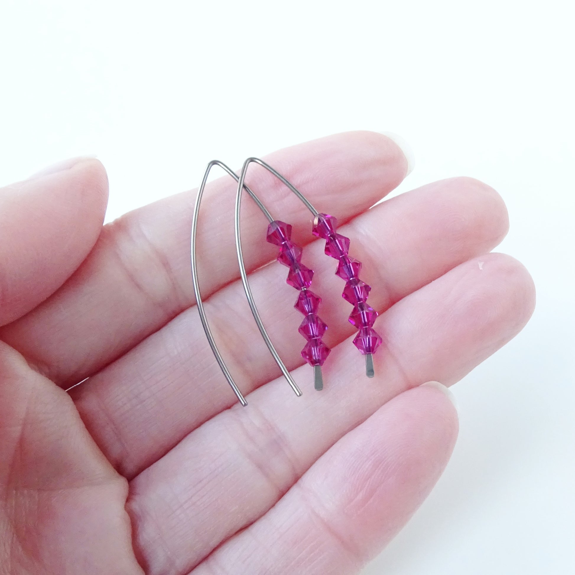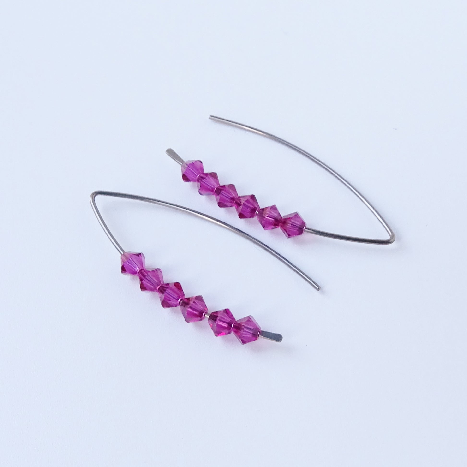 Eye-catching fuchsia crystals on Niobium threader earrings. The Niobium wire is hammered and hand-formed into this elegant wishbone shape. The use of Niobium makes them perfect for when you have sensitive earlobes. These earrings can be matched with a pair of jeans or sparkle with a cocktail dress and will be worn comfortably all day long.