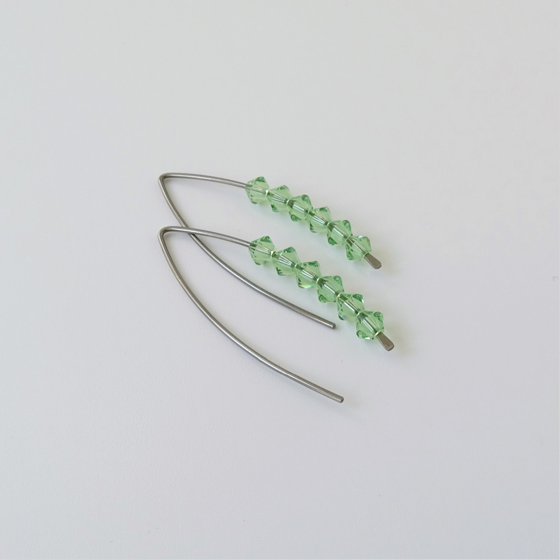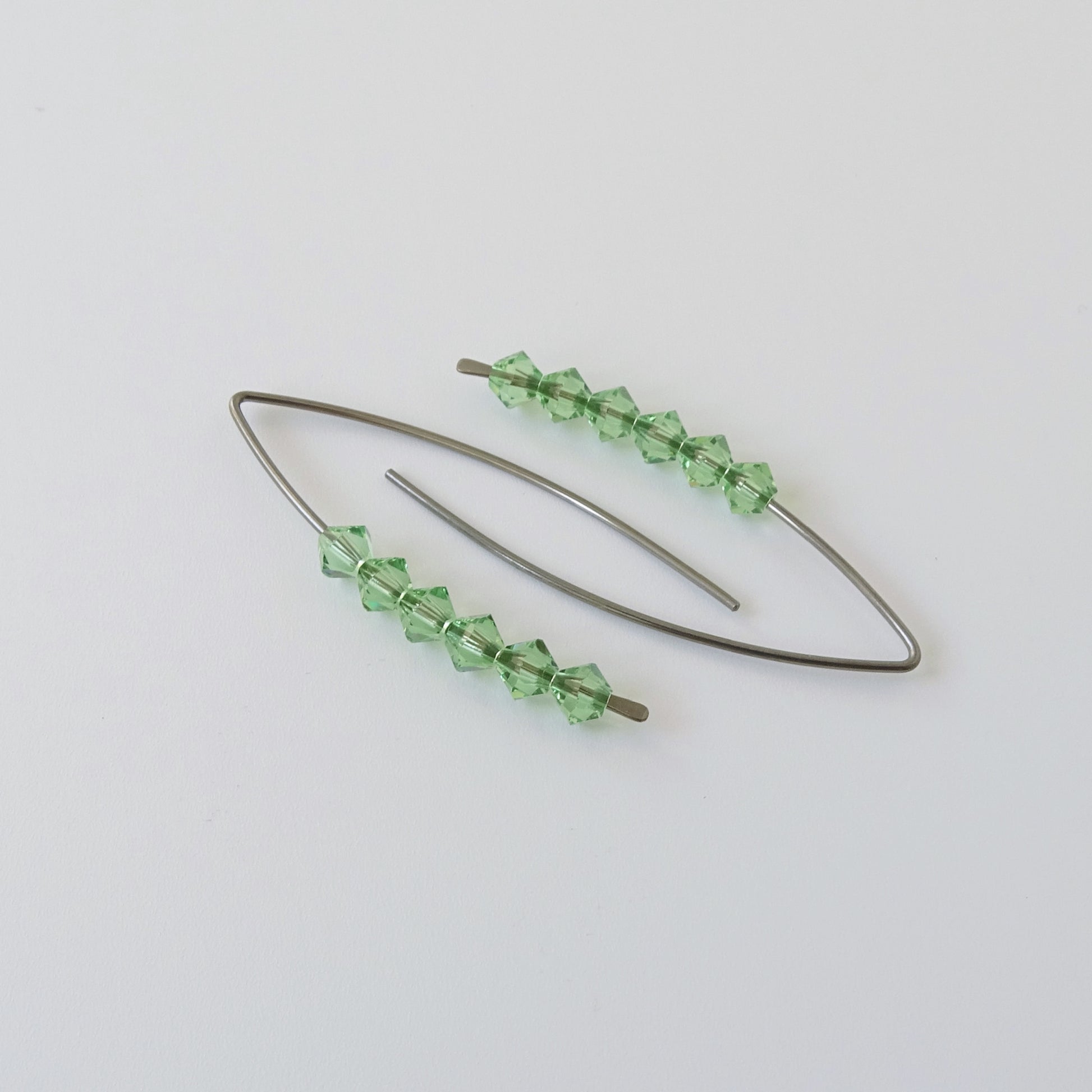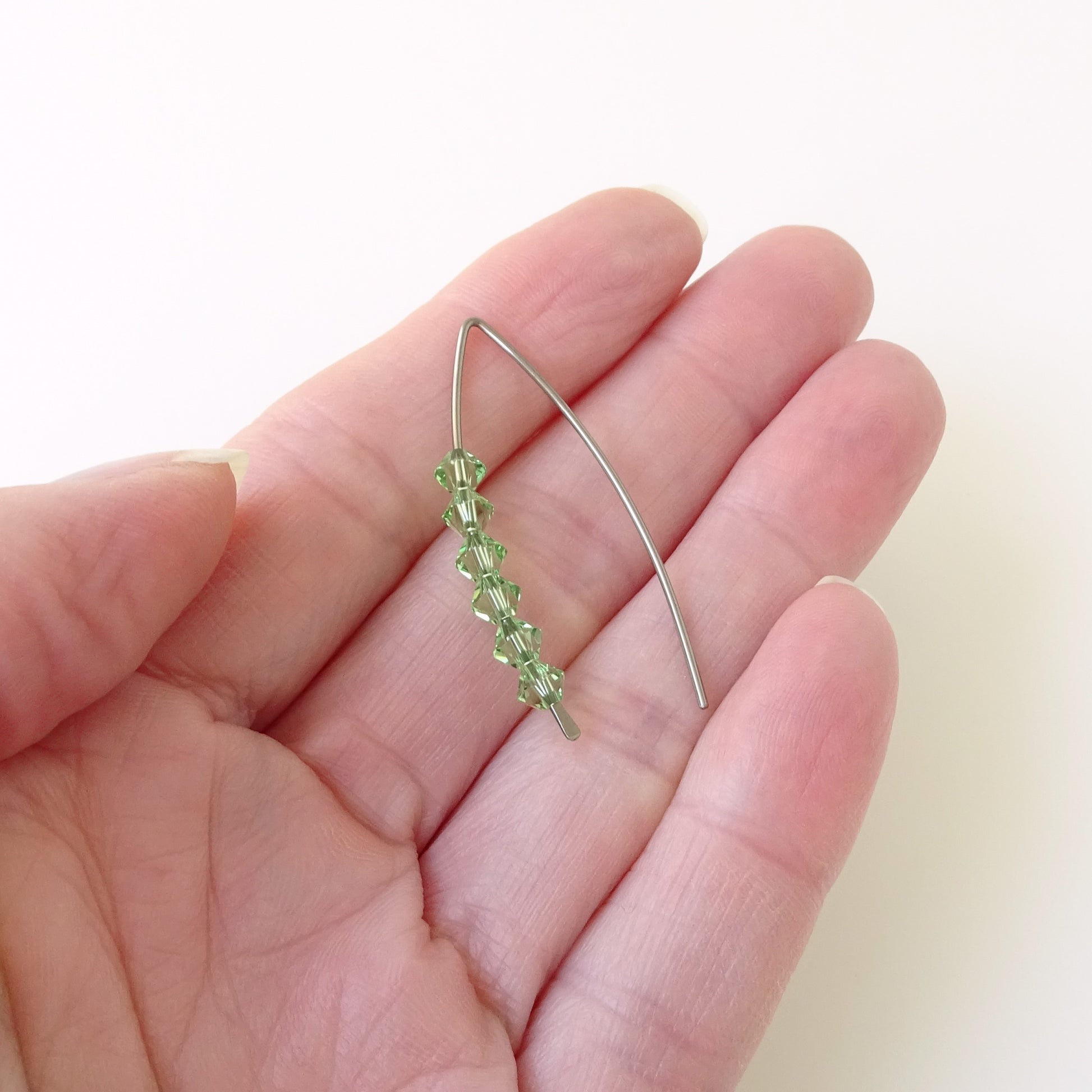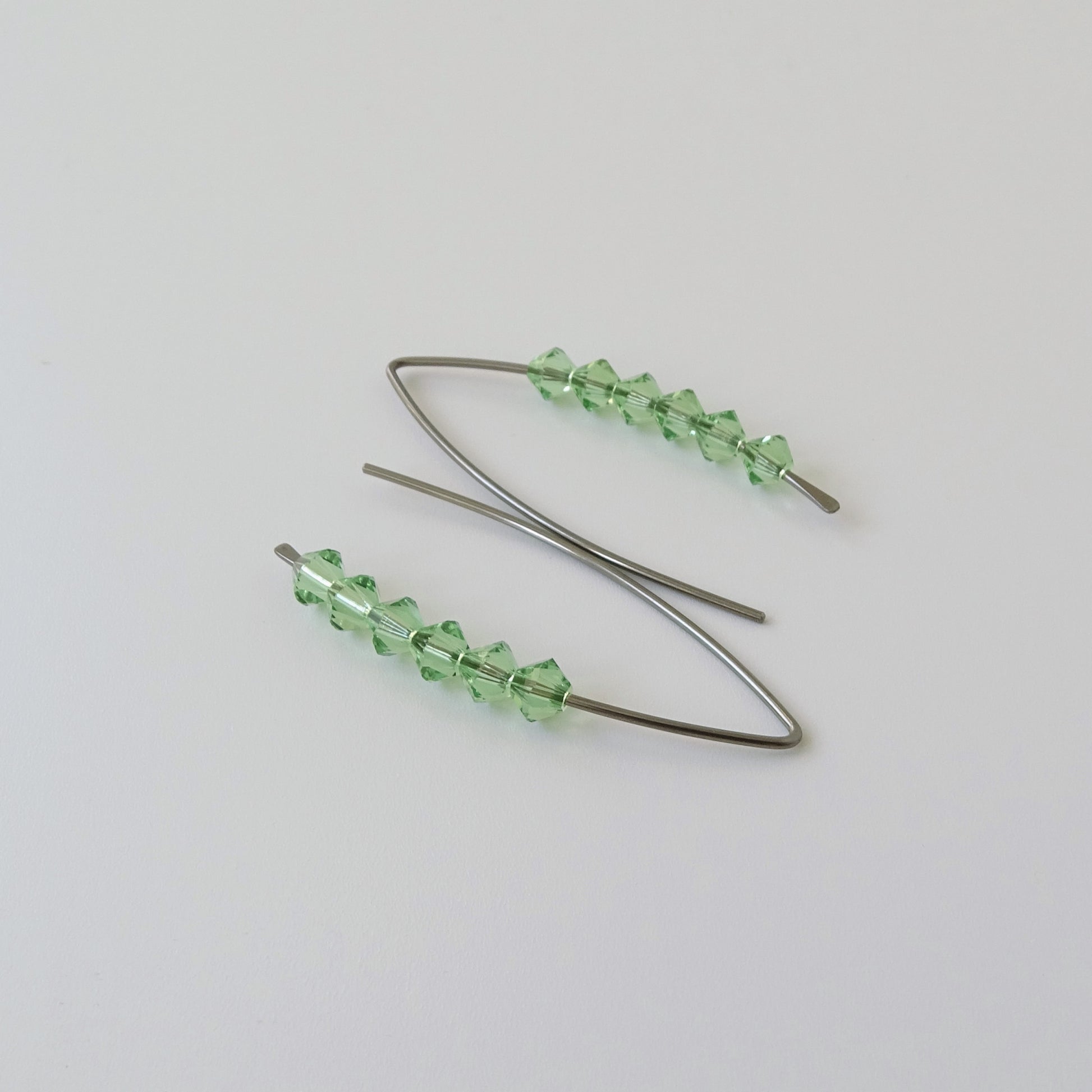 Eye-catching peridot green European crystals on Niobium threader earrings. The Niobium wire is hammered and hand-formed into this elegant wishbone shape. The use of Niobium makes them perfect for when you have sensitive earlobes. These earrings can be matched with a pair of jeans or sparkle with a cocktail dress and will be worn comfortably all day long.