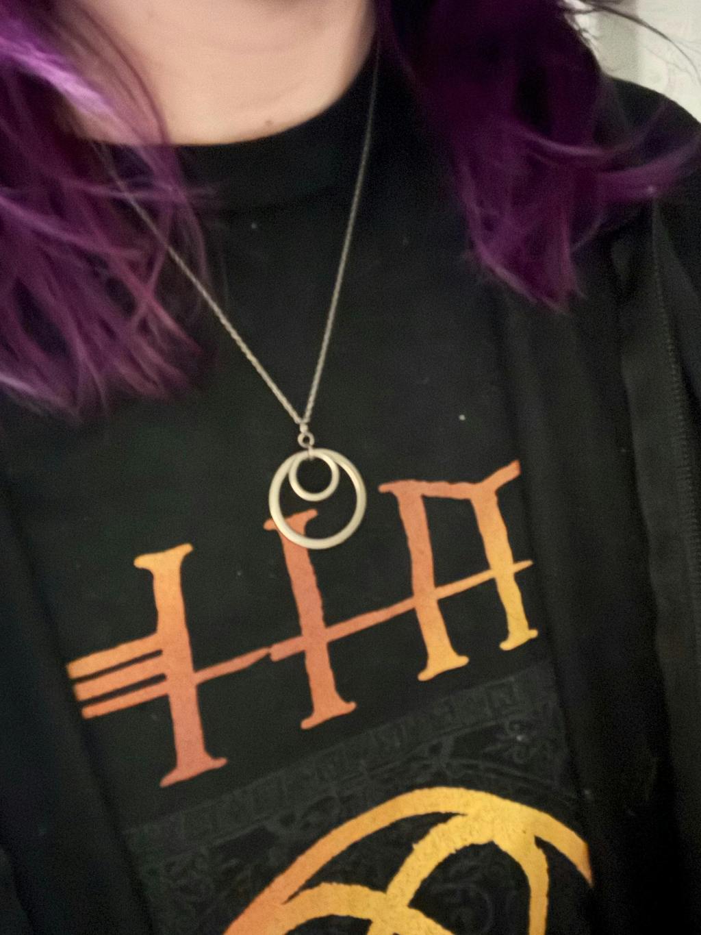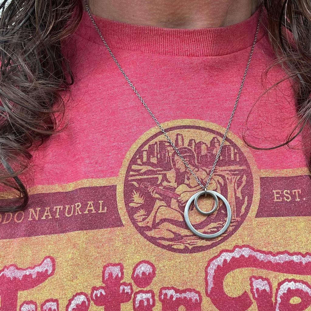 This double-hoop titanium pendant is made out of two titanium circles. They are suspended from a delicate titanium cable chain. The necklace and pendant are entirely made out of hypoallergenic nickel-free titanium and niobium. It's a great necklace to wear every day. Simple and modern and go with everything.