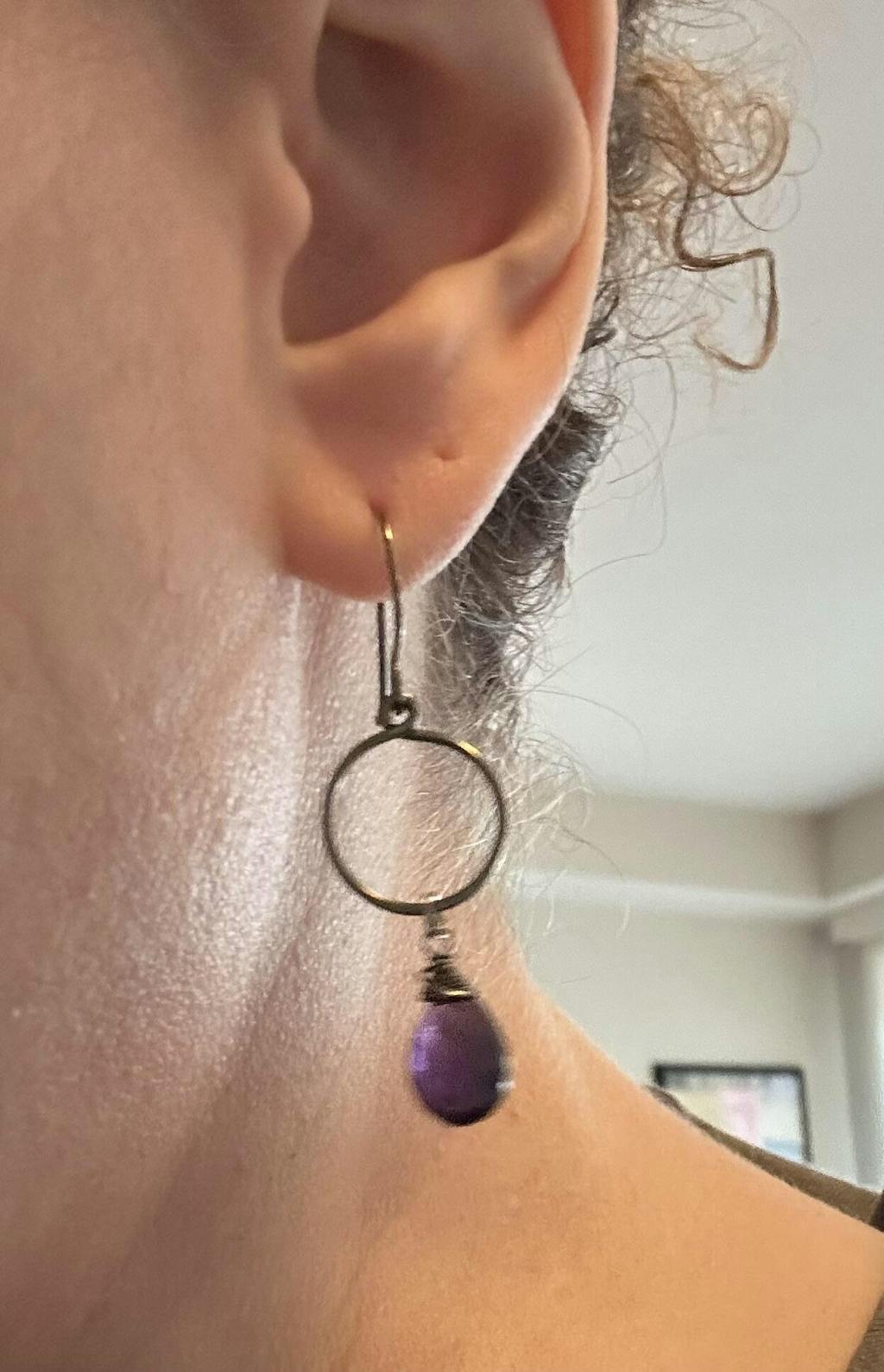 These purple amethyst gemstone briolettes dangle from niobium hoops and are wire wrapped with niobium wire. They dangle from artisan-made niobium or titanium ear wires (your choice in the drop-down menu) This makes them completely hypoallergenic nickel-free and the perfect pair of earrings for sensitive ears.