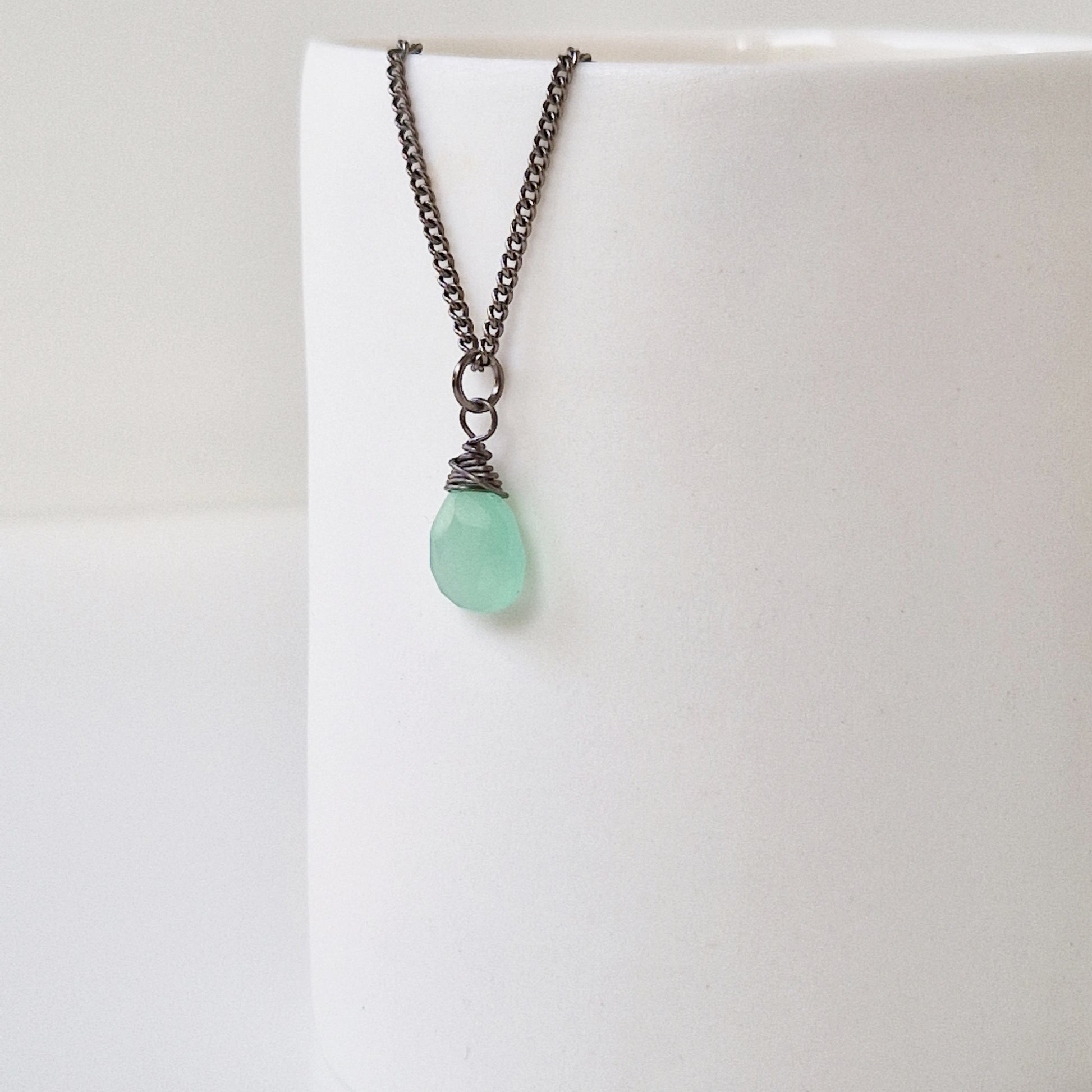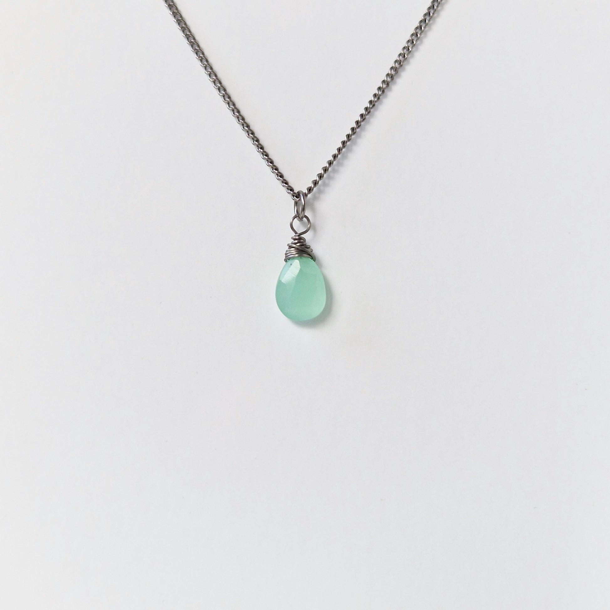This gorgeous mint green chalcedony faceted briolette has been wire wrapped with niobium wire and is suspended from a nickel free titanium curbed chain. The necklace closes with a titanium lobster clasp. This necklace is hypoallergenic and nickel free, especially designed for women with nickel allergies, but can be worn by everybody.